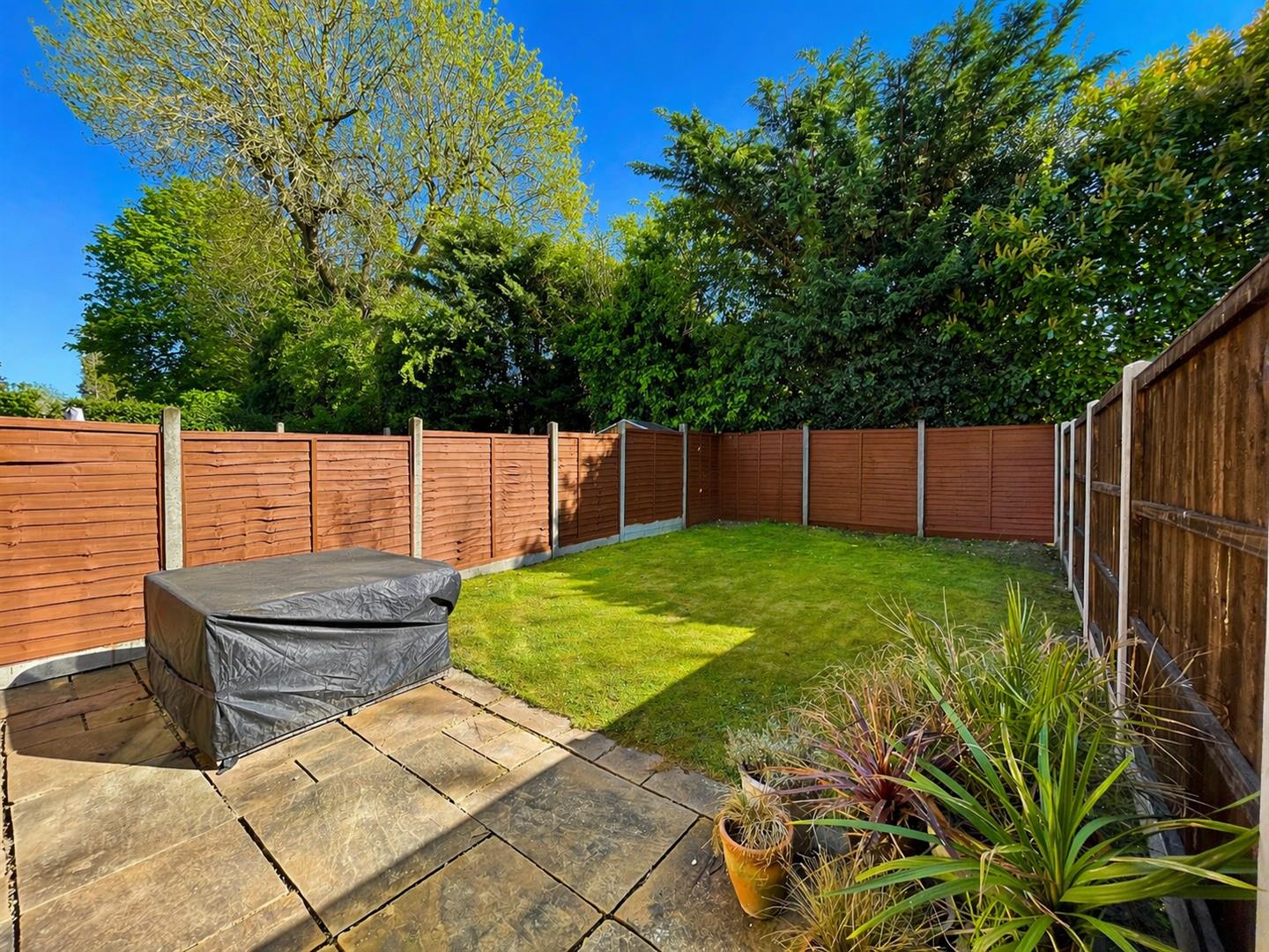 South facing sunny private rear garden, patio area, lawn, tap, lighting