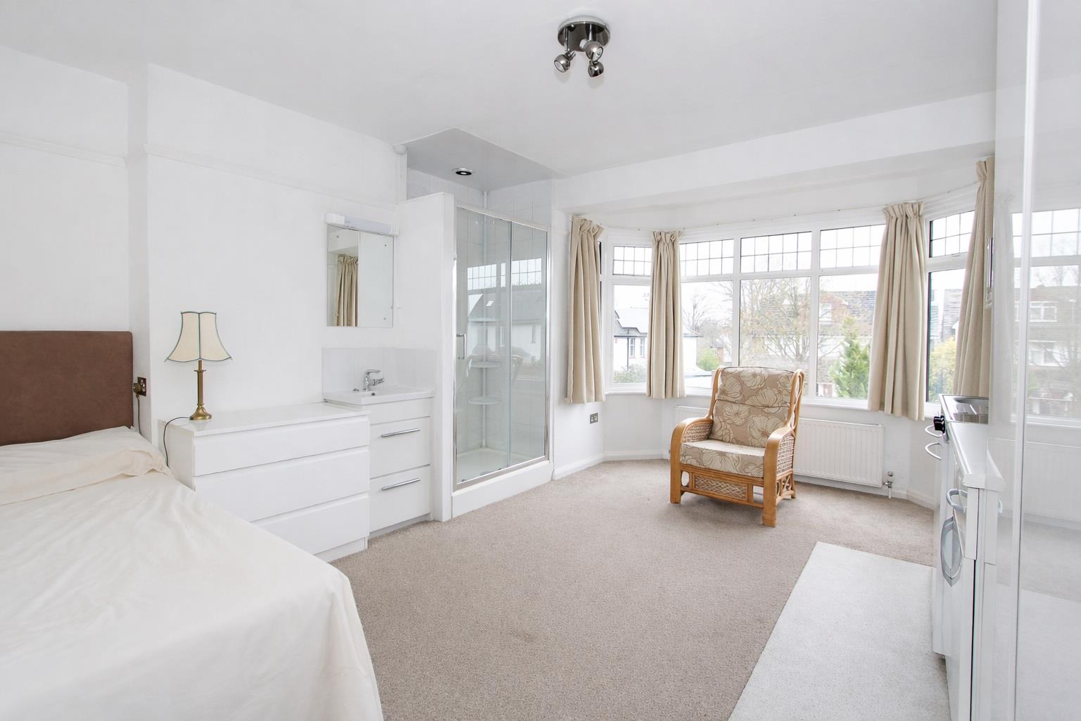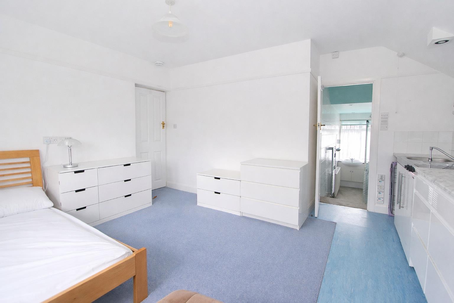 Double glazed bay window to front aspect, double panel radiator, picture rail, tiled cubicle with thermostatic shower and wash hand basin at side, kitchenette and fitted wardrobes