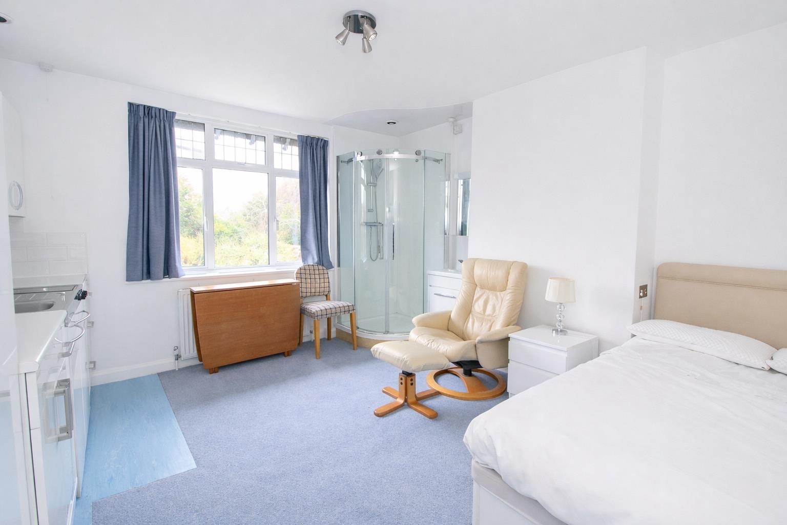 Double glazed window to rear aspect, tiled cubicle with thermostatic shower, double panel radiator, kitchenette and fitted wardrobes.