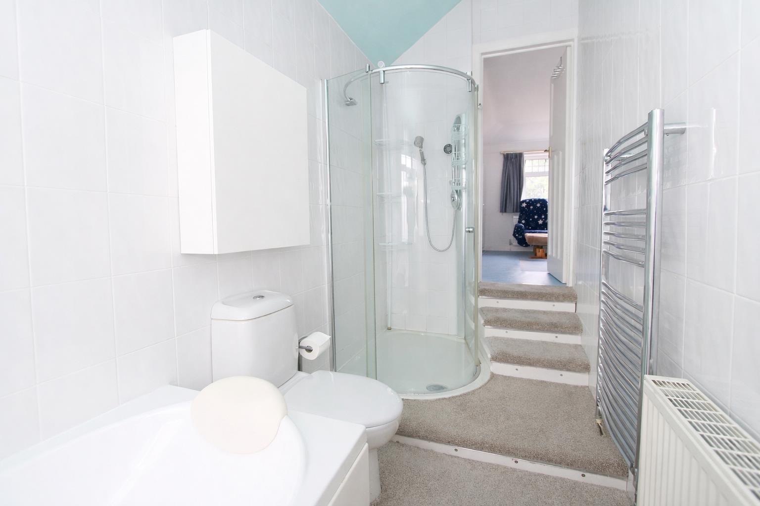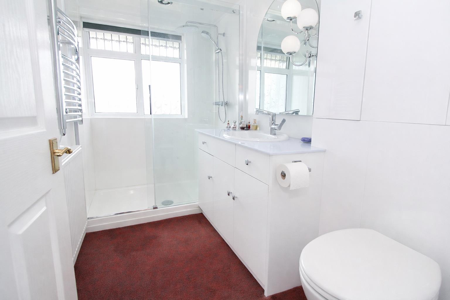 Consisting of panelled walk in cubicle with thermostatic shower and hand attachment, vanity unit with wash hand basin and chrome mixer tap, low-level flush WC, fitted storage cupboards, single panel radiator, heated chrome towel rails, wall mounted heater, obscure double glazed window to front aspect.