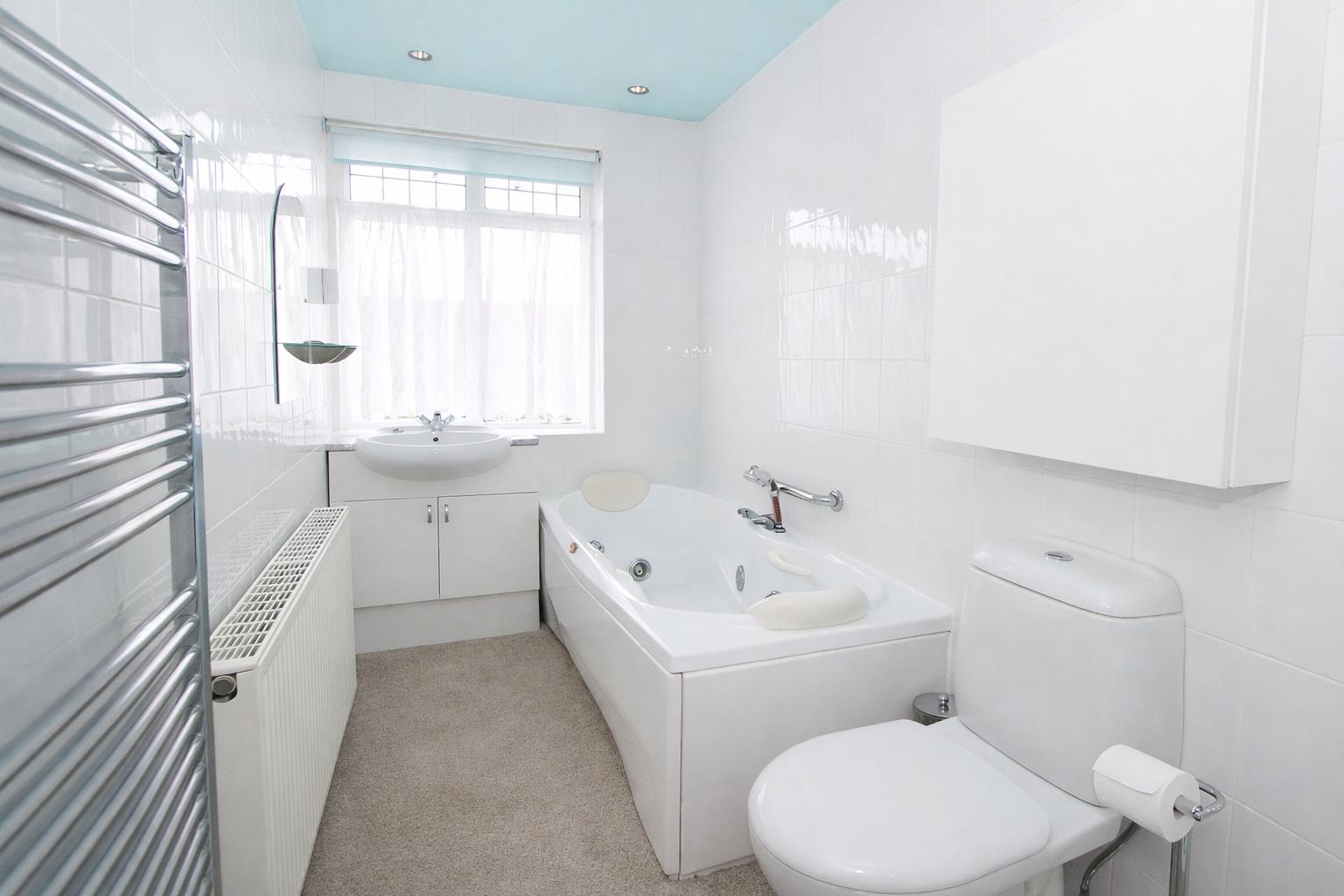 Comprising panel enclosed Jacuzzi bath with chrome mixer tap and shower attachment, tiled cubicle with thermostatic shower, wash hand basin with chrome mixer tap and storage cupboards below, low-level push button flush WC, double panel radiator, heated chrome towel rail, double glazed window to front aspect, fully tiled wall walls.