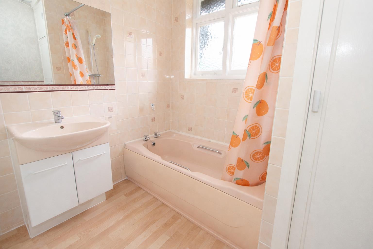 Comprising panel enclosed bath with chrome taps and thermostatic shower, wash hand basin with chrome mixer tap and storage cupboards below, wall mounted heater, cupboard housing “Worcester” boiler and hot water tank, obscure glazed window to rear aspect, shaver point.