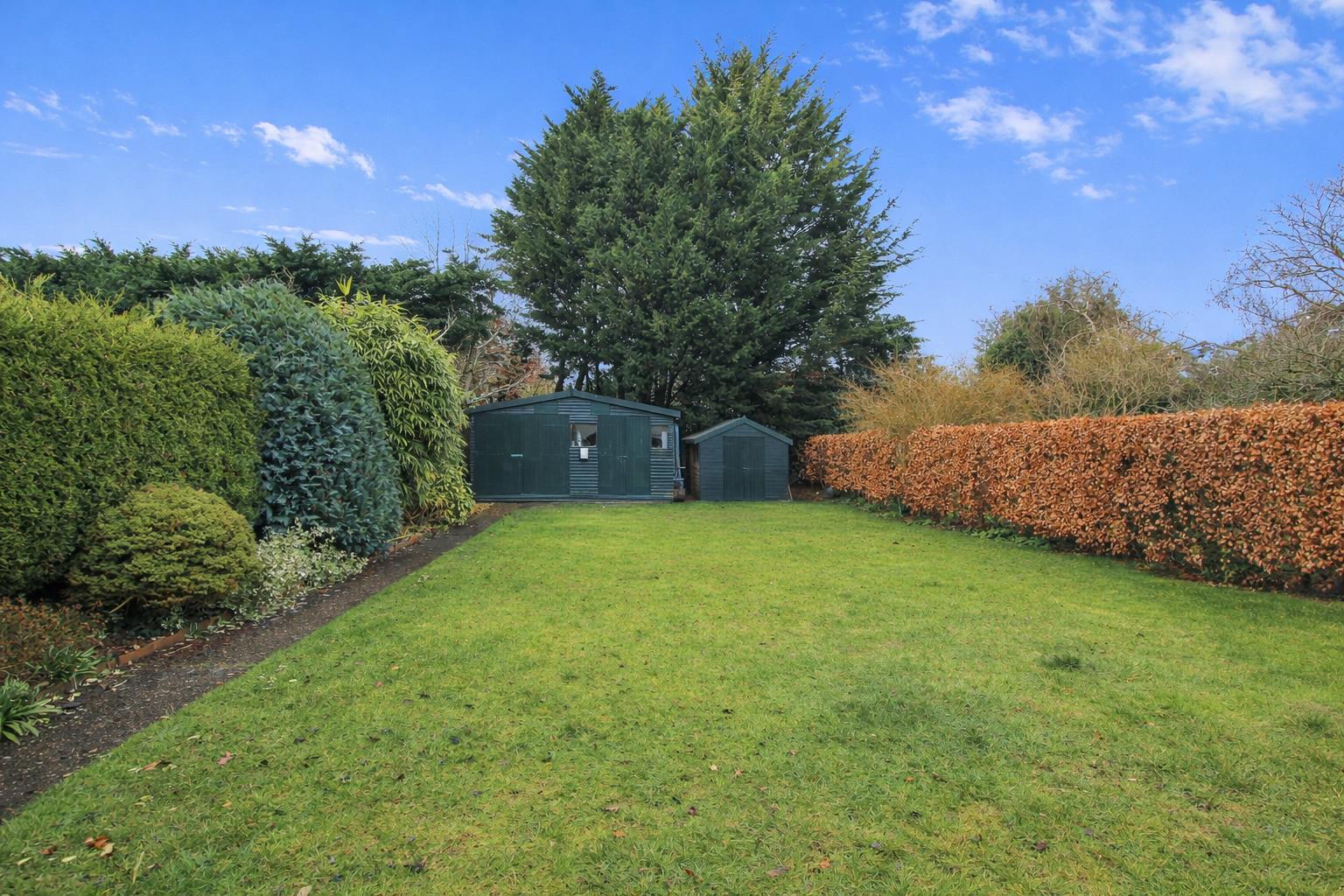 Large paved patio area leading to lawn section with mature shrubs and hedges bordering, large detached workshop and garden shed, outside water and power supply.