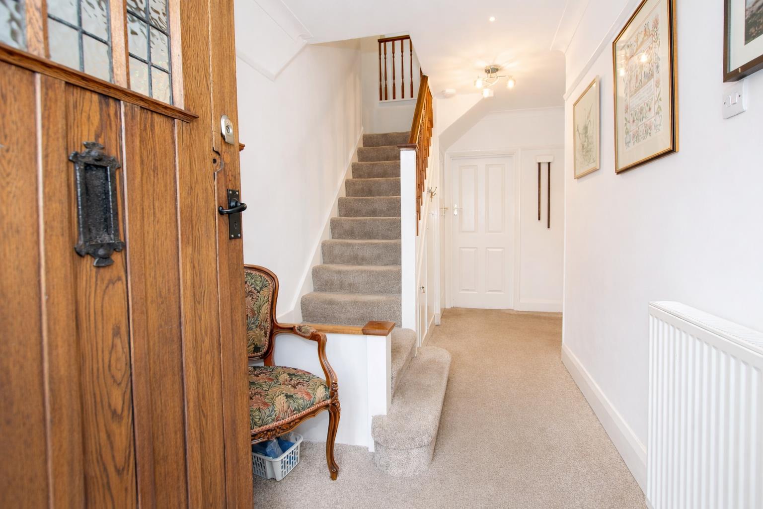 Obscure glazed leaded light windows to front aspect, double panel radiator, under stairs storage cupboard, picture rail, coved ceiling.