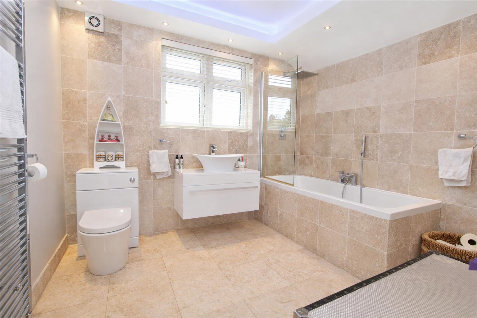 Upstairs, there are three bedrooms, two of which are large doubles and the large modern family bathroom with Travertine tiled walls and flooring adds a touch of luxury as does the floating vanity unit with bowl style sink and double ended bath with centred chrome mixer tap and shower attachment as well separate chrome shower fittings.