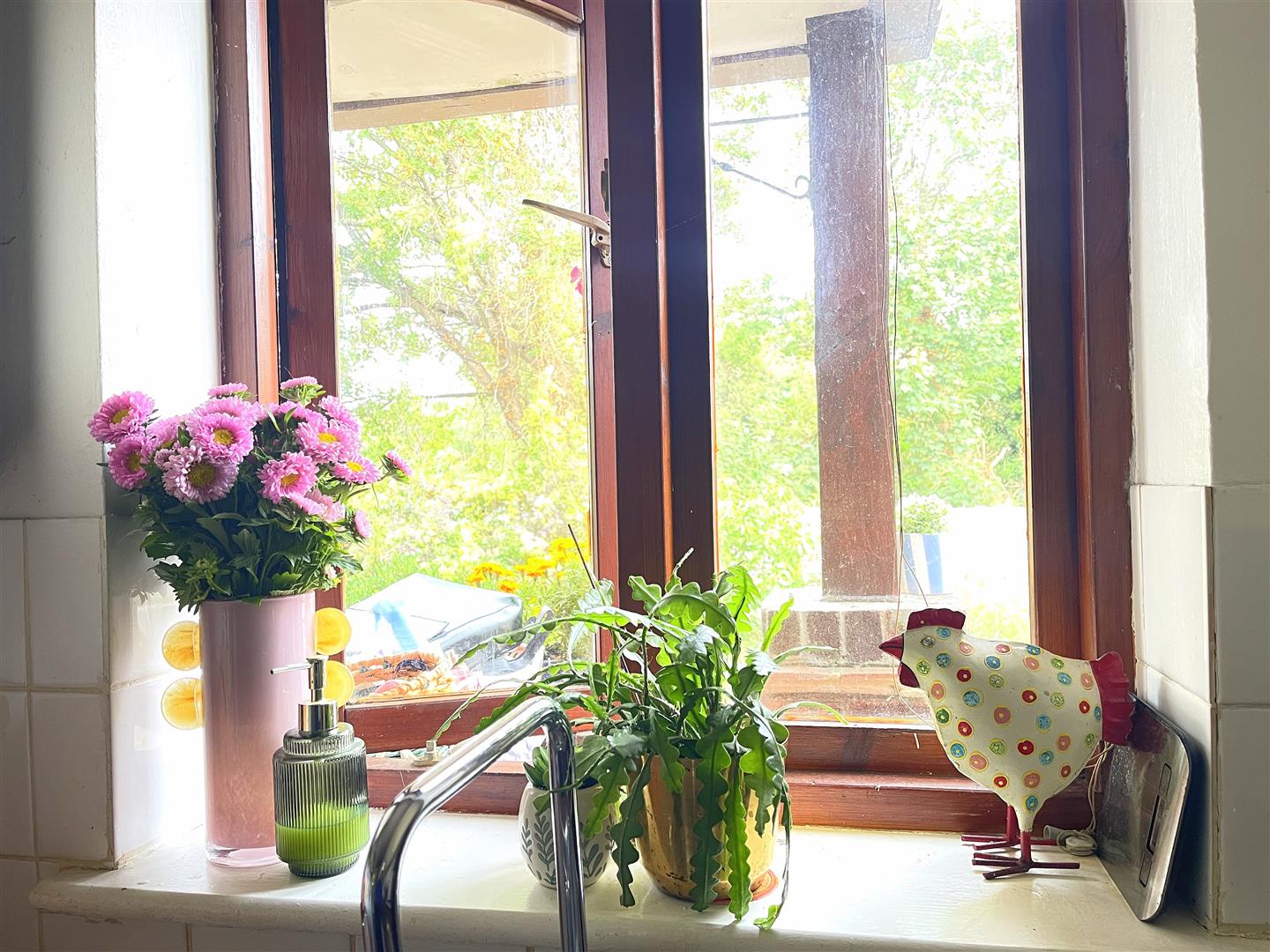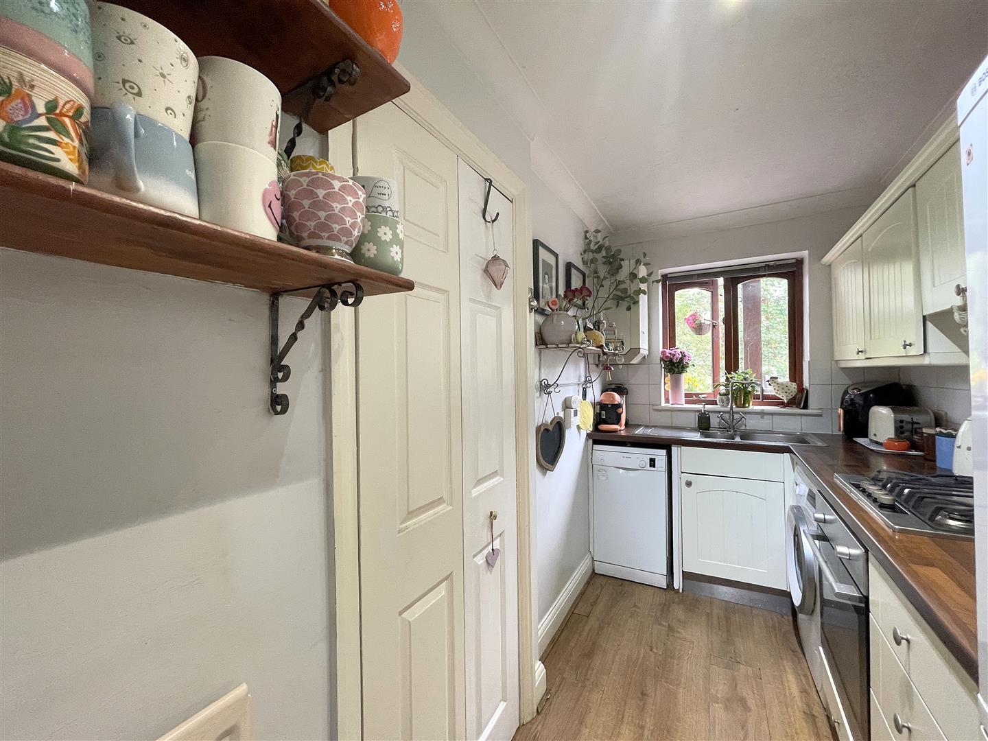 Range fitted wall units with matching cupboards and drawers below, wood effect roll top work surfaces with inlaid stainless steel 1/2 bowl sink and chrome tap, inset four ring gas hob with extractor fan above and oven/grill below, space for dishwasher, space for fridge/freezer, space and plumbing for washing machine, tiled splash back, wood effect flooring, wall mounted boiler, coved ceiling, single panel radiator, double glazed window to front aspect.