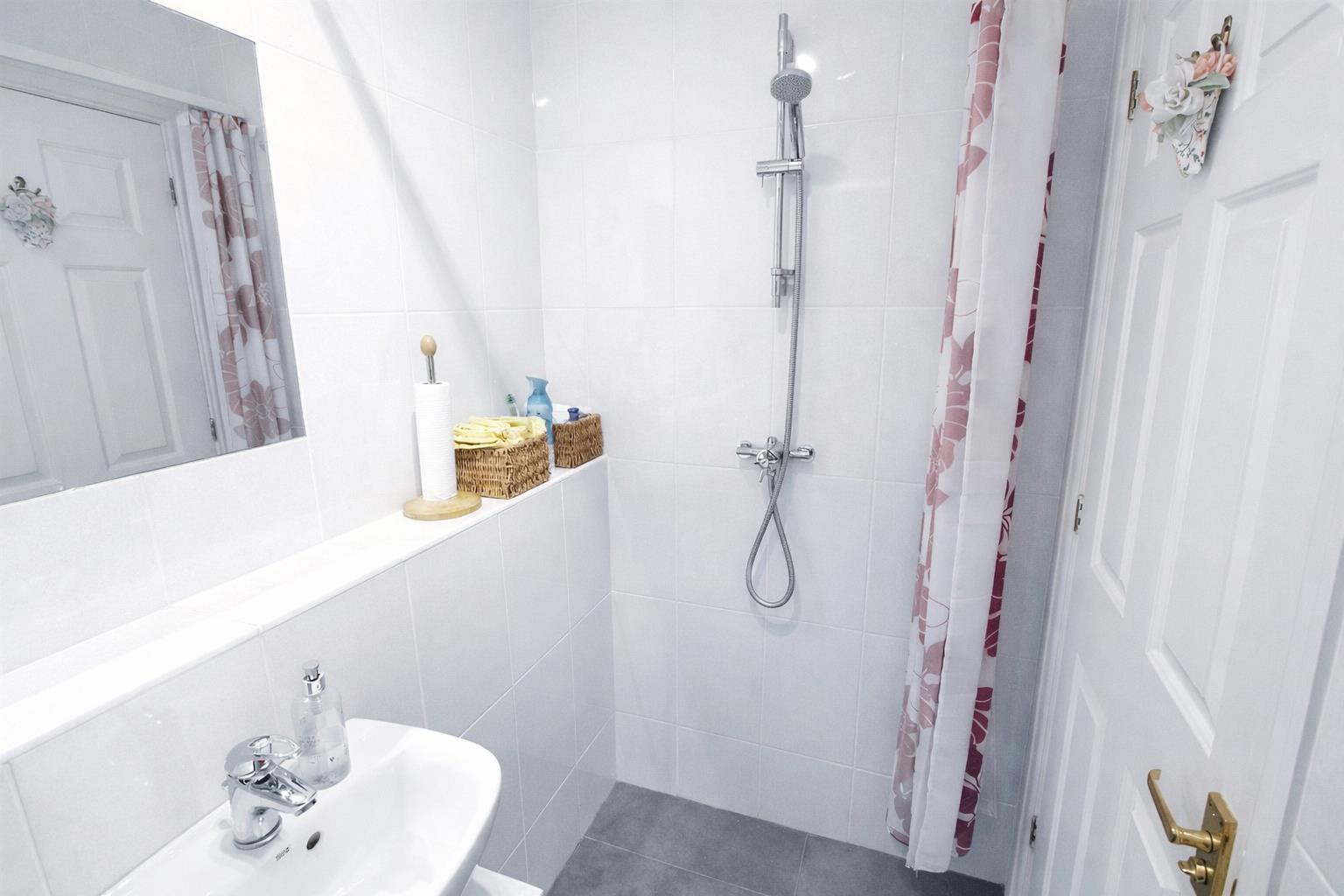Consisting of thermostatic shower with floor drainer, wash handbasin with chrome mixer tap, low-level pushbutton flush WC, single panel radiator, extractor fan, tiled flooring, tiled walls, obscure double glazed window to front aspect.