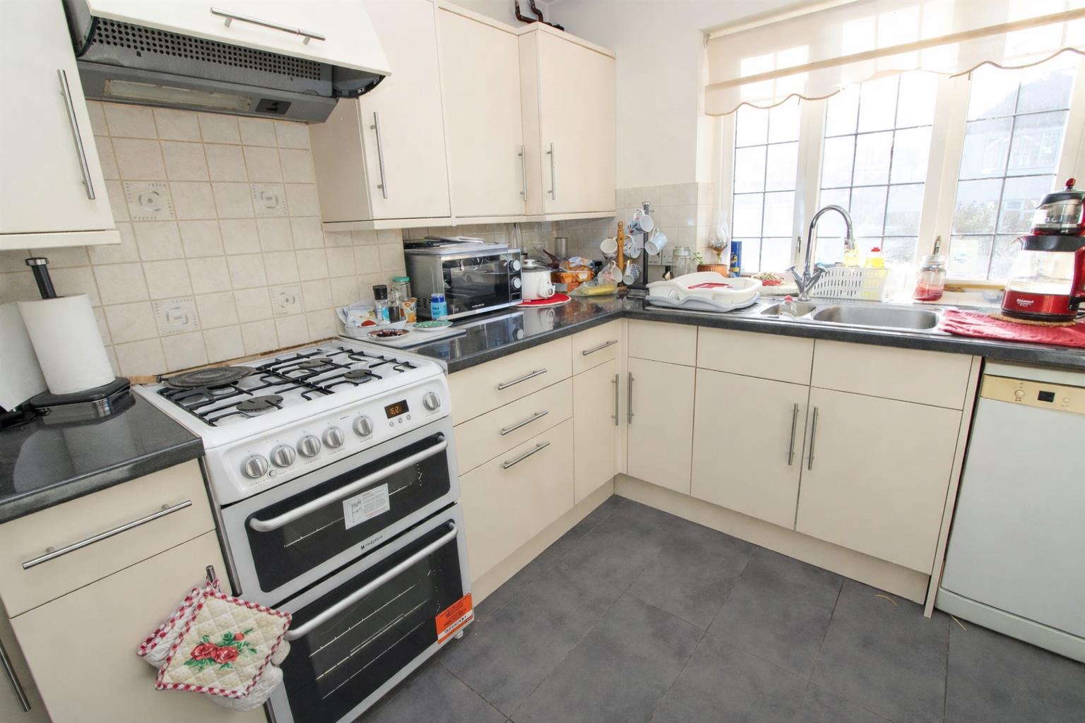 Range of fitted wooden wall units with matching cupboards and drawers below, granite effect rolltop worksurfaces with inlaid stainless steel sink and chrome mixer tap, space for cooker, space and plumbing for dishwasher, space for tall standing fridge/freezer, cupboard housing, boiler, tiled flooring, tiled splashback, double glazed window to front aspect.