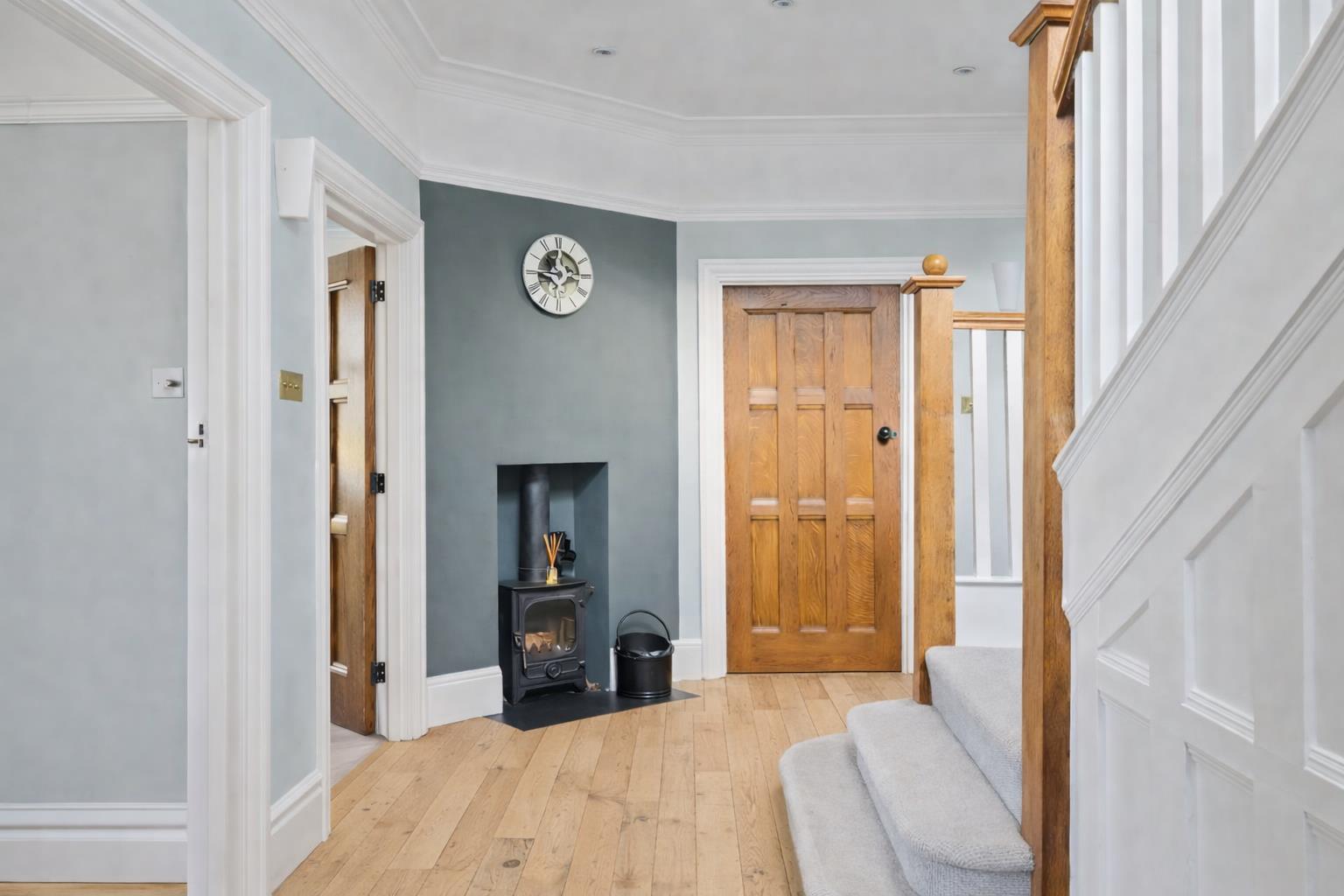On entering the property, a spacious reception hall awaits and will impress you with its stripped wood flooring, turning staircase and fireplace housing a log burner. The heritage colour palette to the walls is echoed throughout the house providing an interior which is not only stylish and elegant, but light and airy.