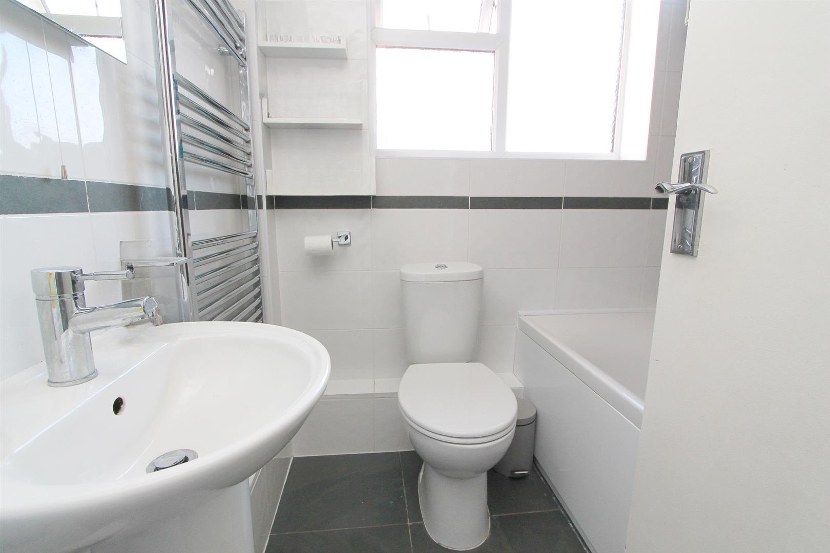 Modern white suite comprising of panel enclosed bath with chrome mixer tap and thermostatic shower, pedestal wash hand basin with chrome mixer tap, low level push button flush WC, heated chrome towel rail, tiled flooring, tiled walls, extractor fan, obscure UPVC double glazed window to side aspect.