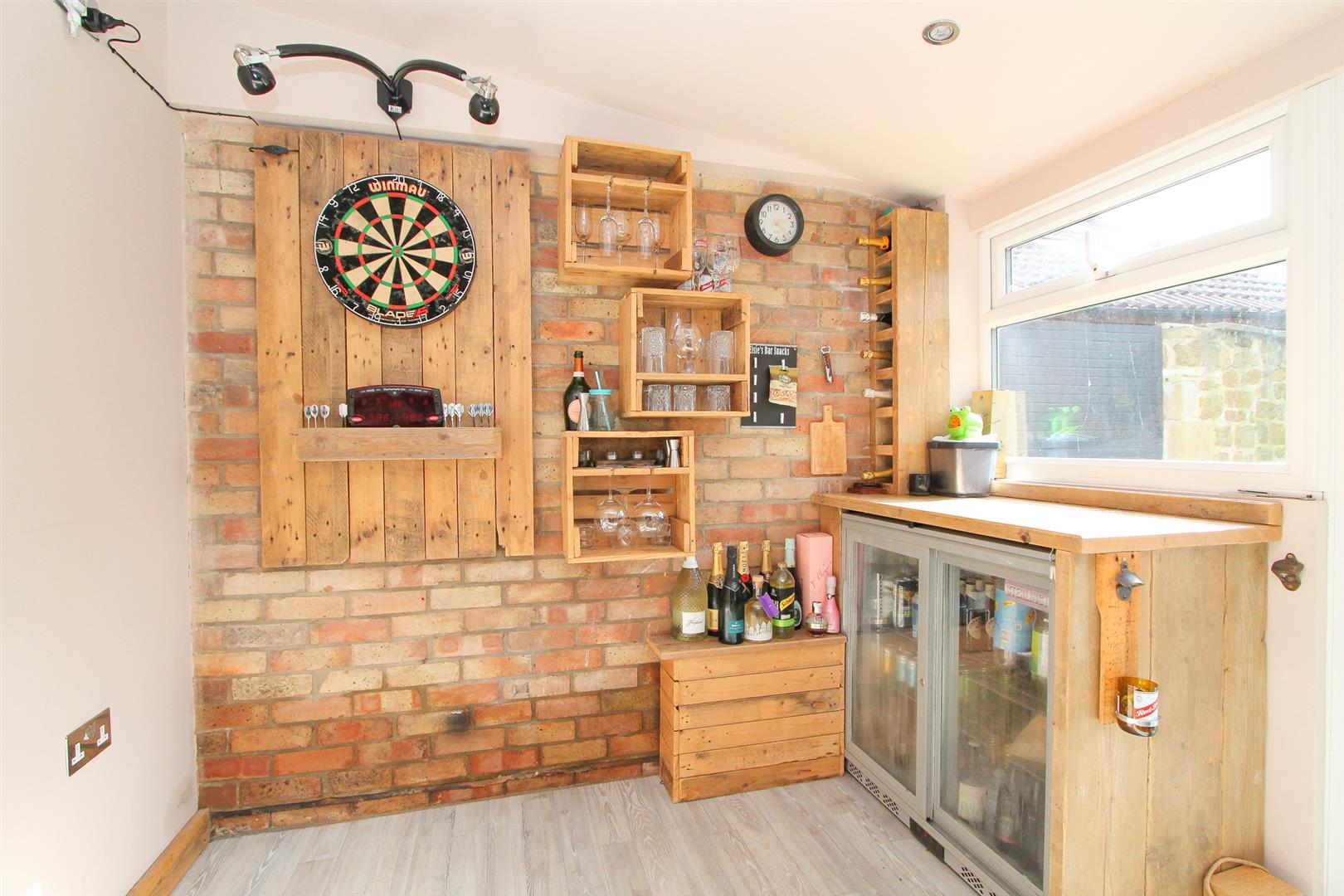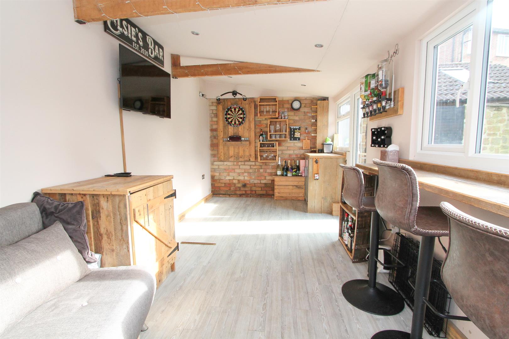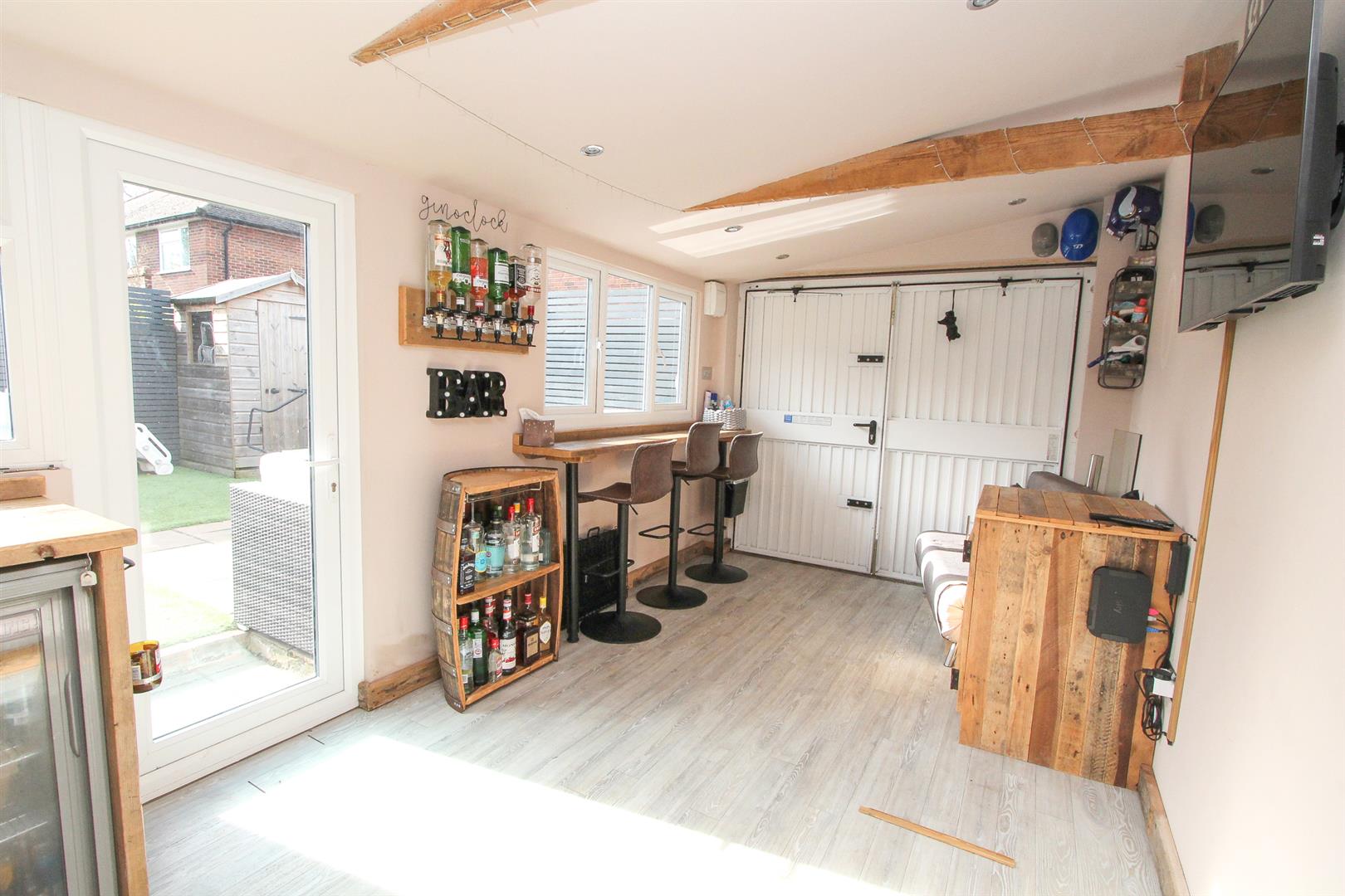 Garage at side – currently used as bar area/office Double doors at front.
