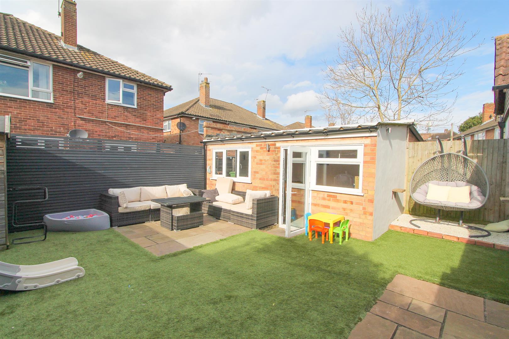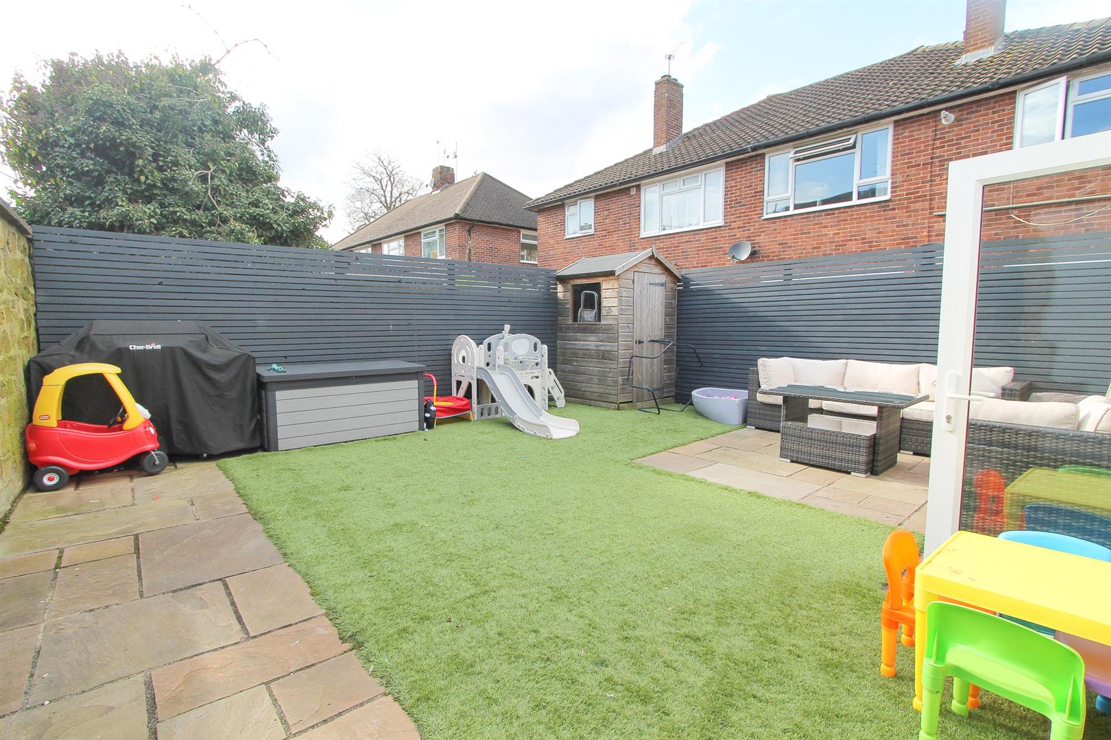 Artificial lawn section with sandstone paved patio area and side access, garden shed, fence enclosed.