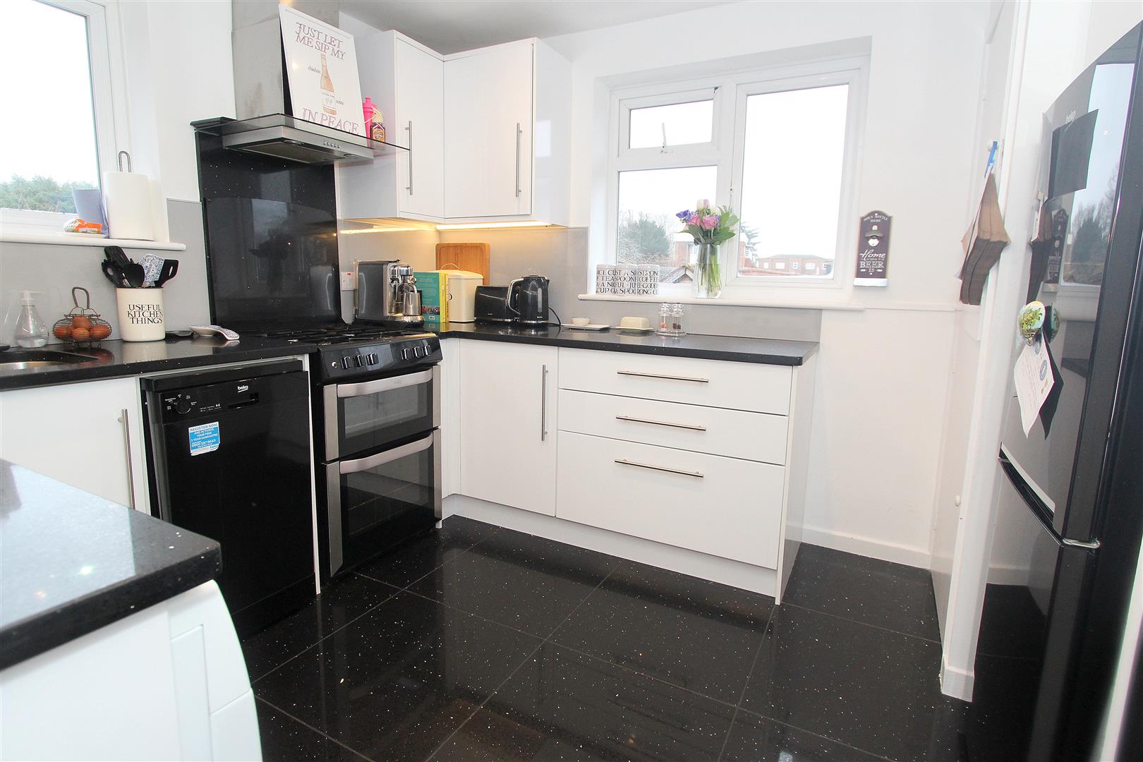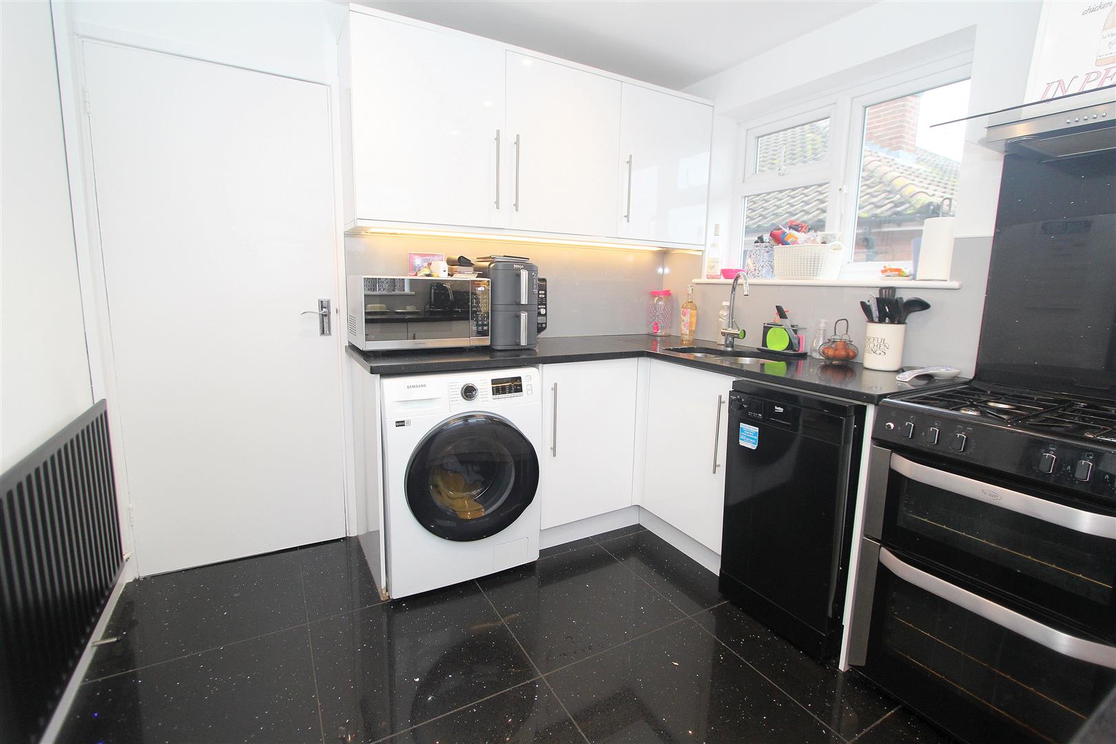 Modern range of fitted wooden wall units with matching cupboard and drawers below, Quartz worktops with inlaid stainless steel sink and chrome mixer tap, space for cooker, space and plumbing for washing machine and dishwasher, Quartz tiled flooring with underfloor heating, space for tall standing fridge/freezer, single panel radiator, cupboard housing combination boiler, tiled splash back, UPVC double glazed windows to side and rear aspects.
