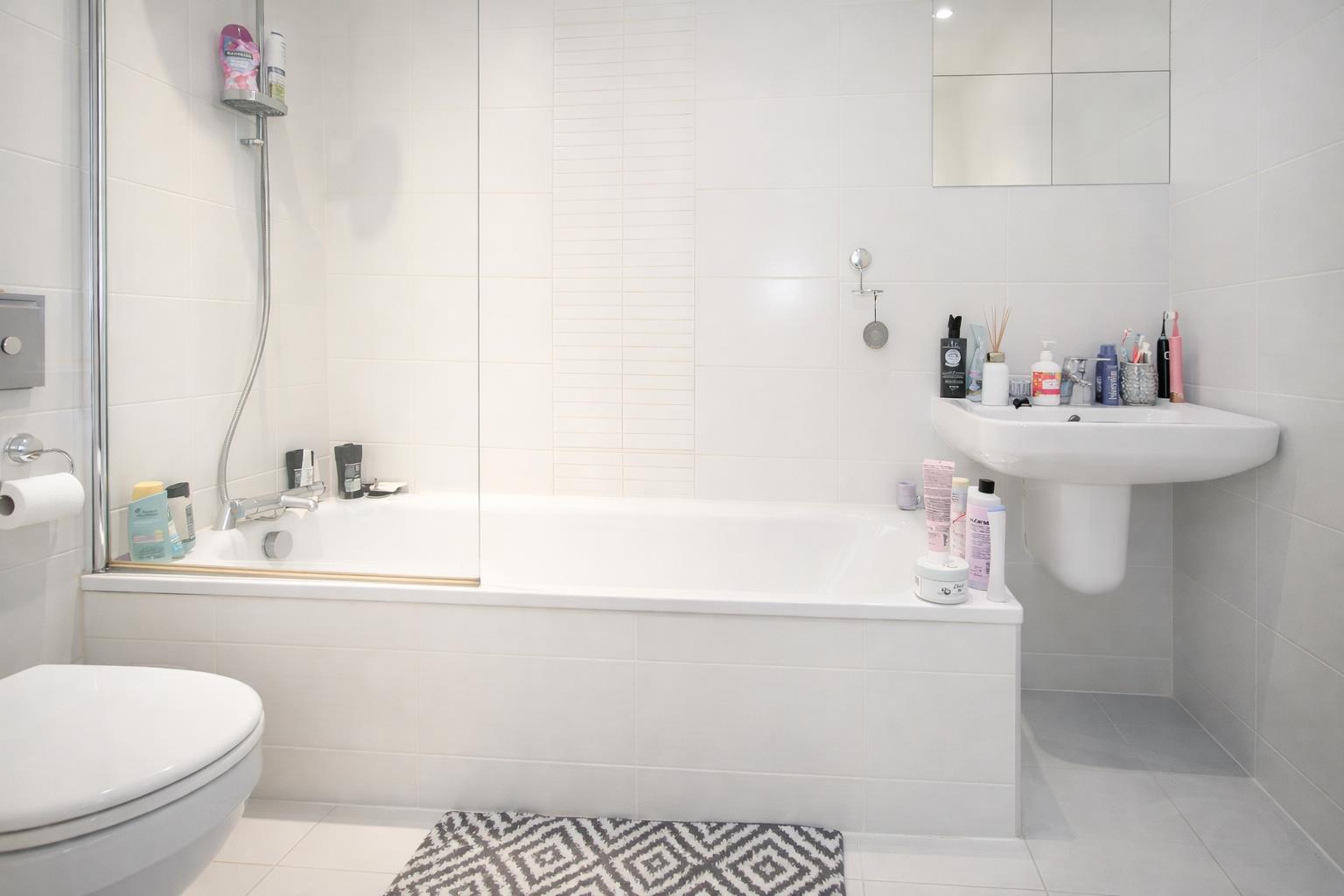 Three piece suite comprising panel enclosed bath with chrome mixer tap and shower attachment, floating wash hand basin with chrome mixer tap, low-level push button flush WC, tiled walls, tiled flooring, extractor fan.