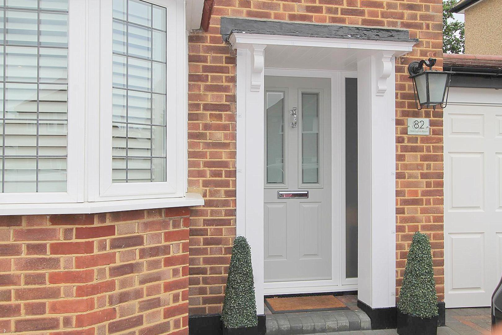 Dark Grey aluminium bi-fold doors with integrated blinds leading through to a well kept south-facing garden with composite decking and artificial grass