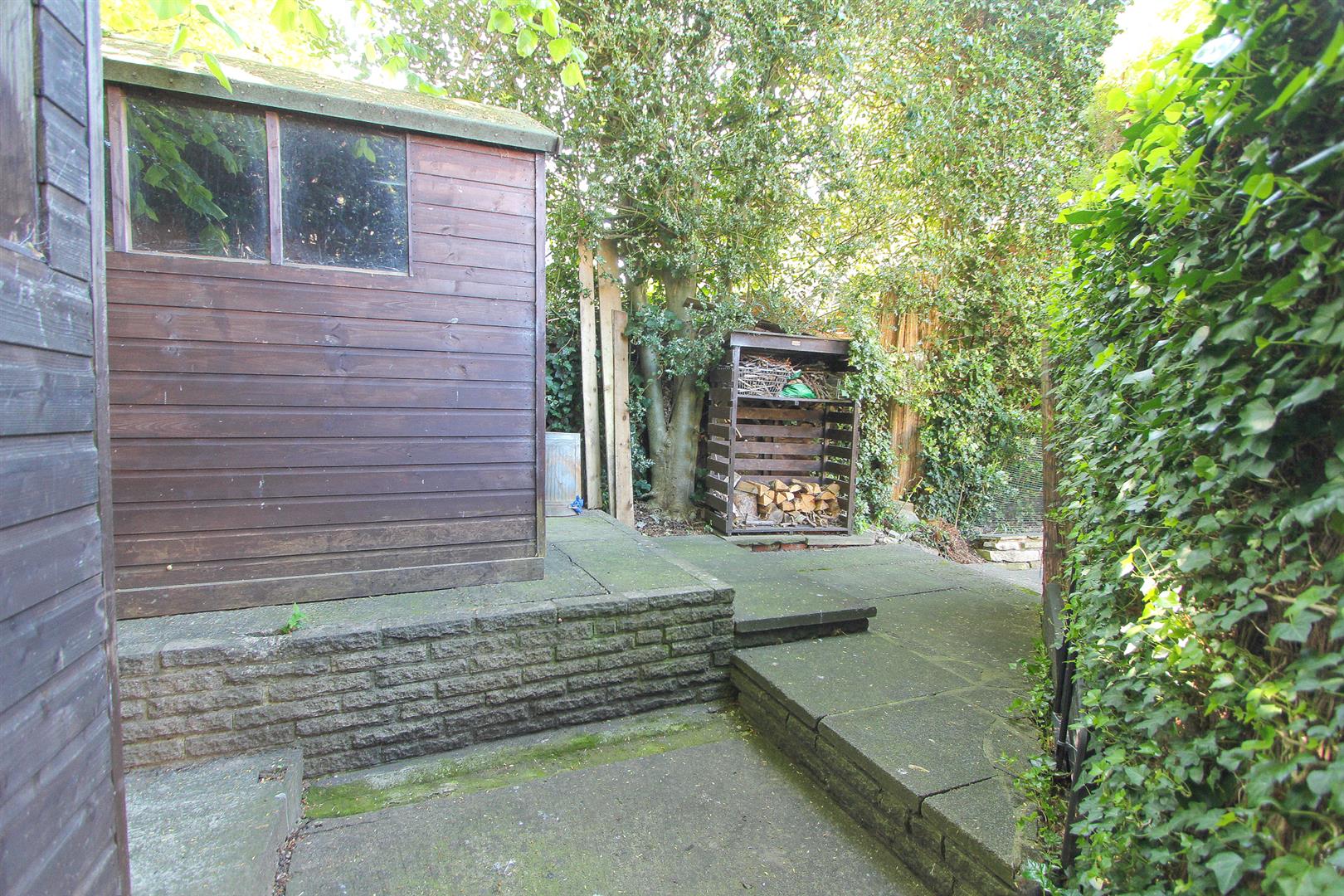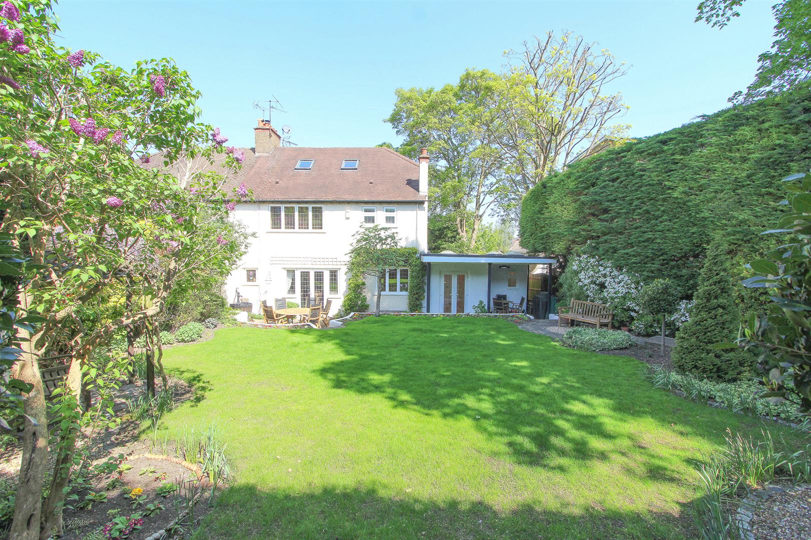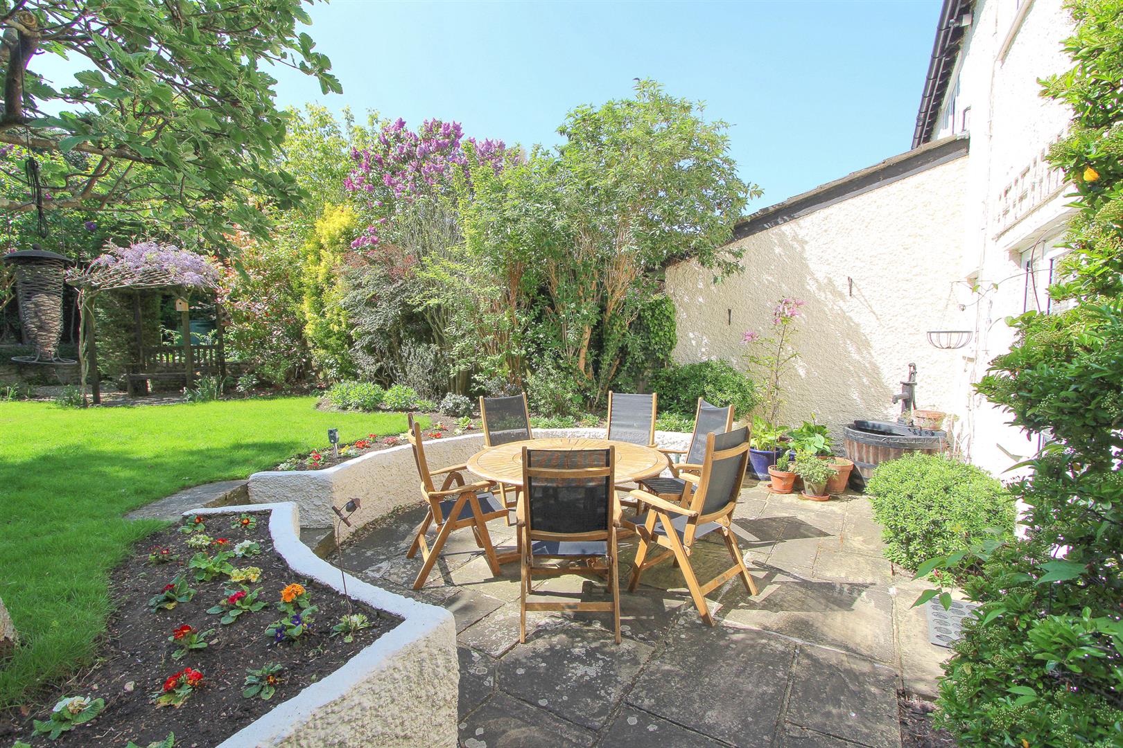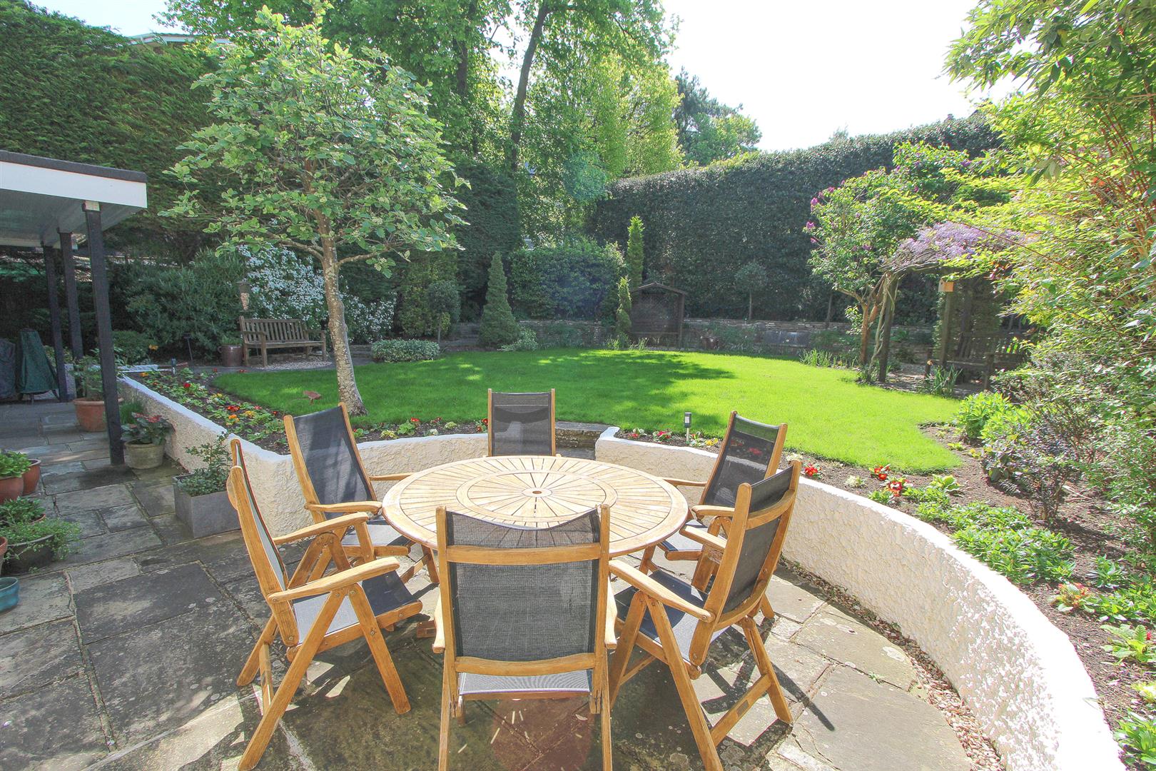 Large paved patio area and sheltered seating section with steps leading to rear, mainly laid to lawn with mature shrubs and flowerbeds bordering with an abundance of hedges and trees, outside tap and power supply, side access, fence enclosed, two garden sheds.