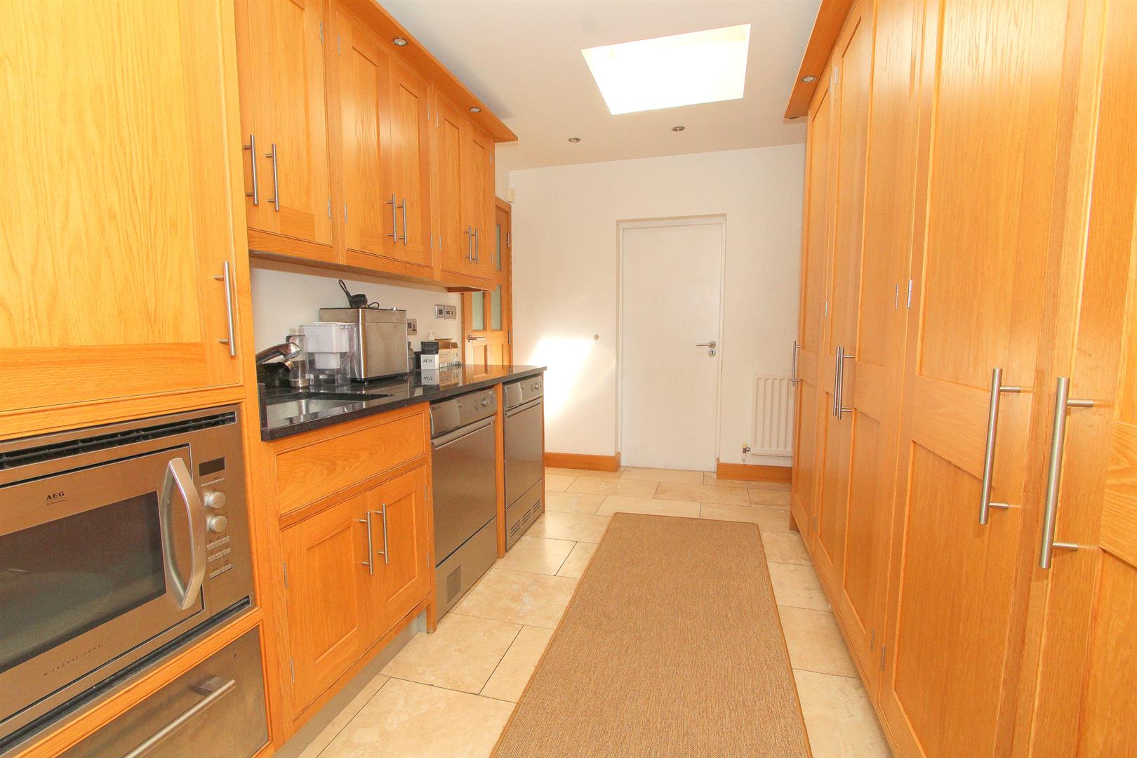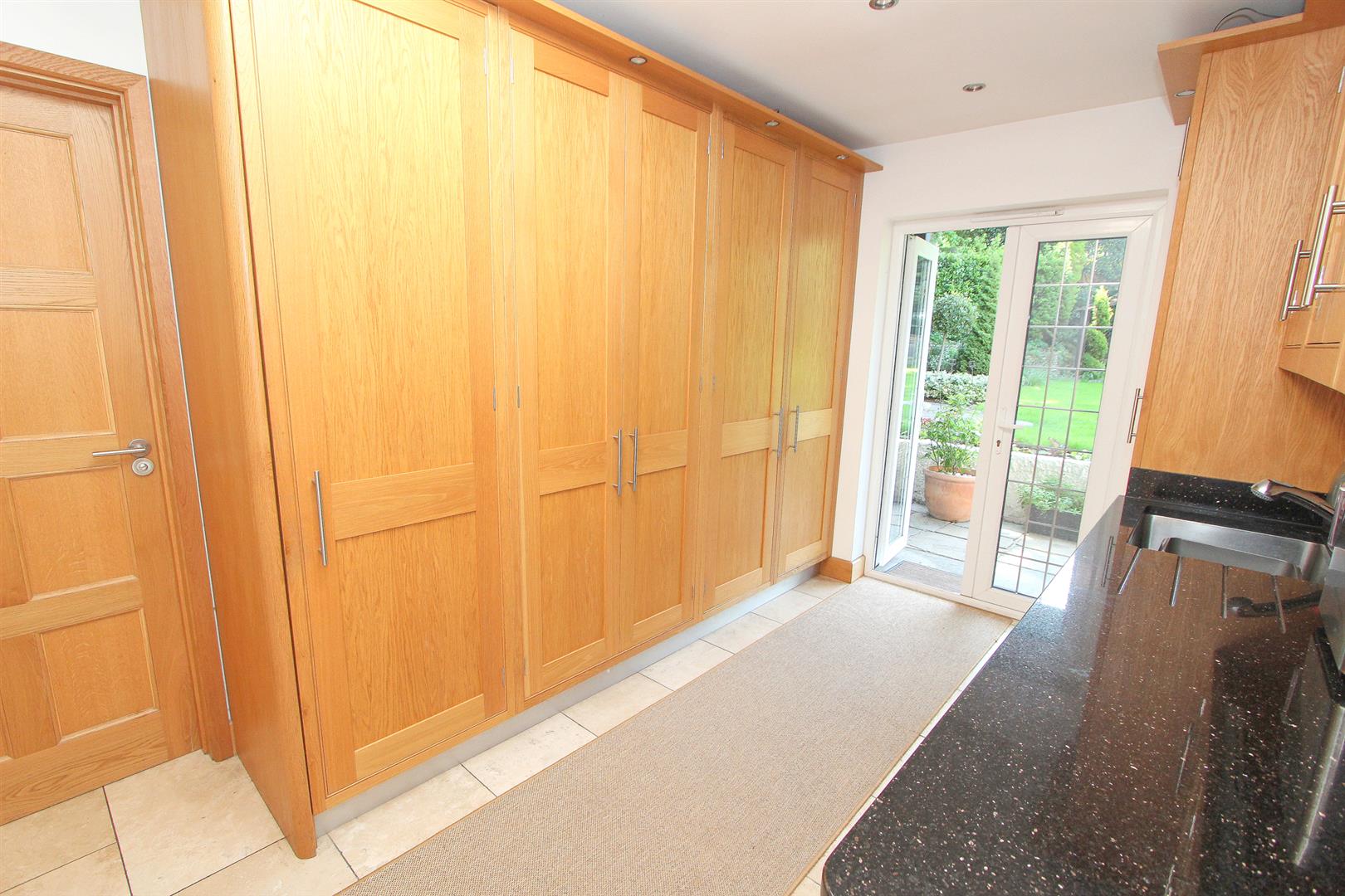 Range fitted of fitted wall units with matching cupboards below, further fitted storage cupboards, integrated AEG Combi oven with heated plate rack, quartz worktop with inlaid “Franke” sink and chrome mixer tap, space and plumbing for washing machine and dishwasher, integrated fridge and large freezer, feature skylight, tiled flooring, UPVC double glazed leaded light French doors leading to rear aspect, single panel radiator, access to garage, tiled flooring.