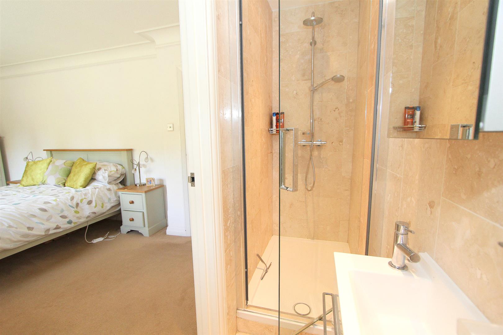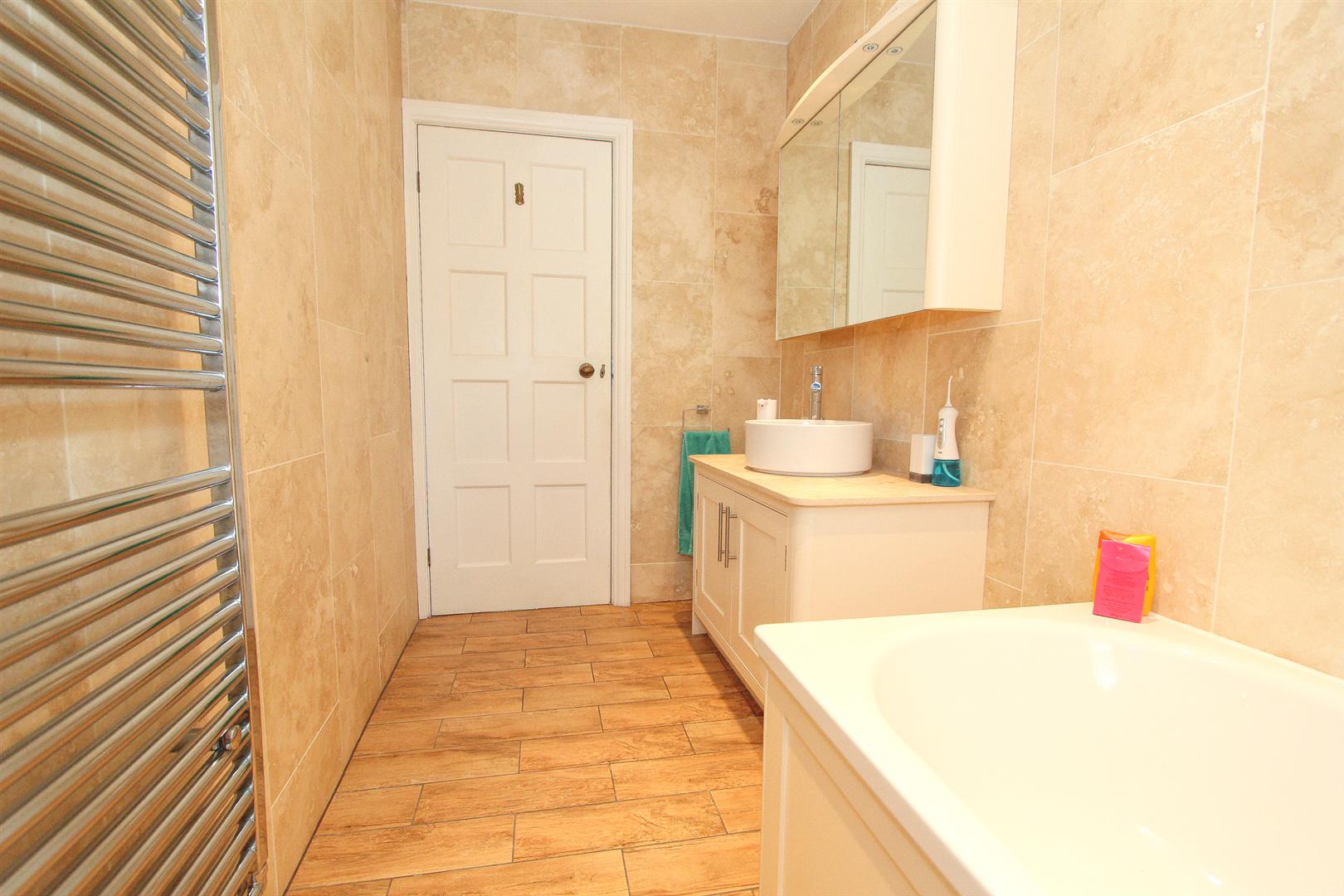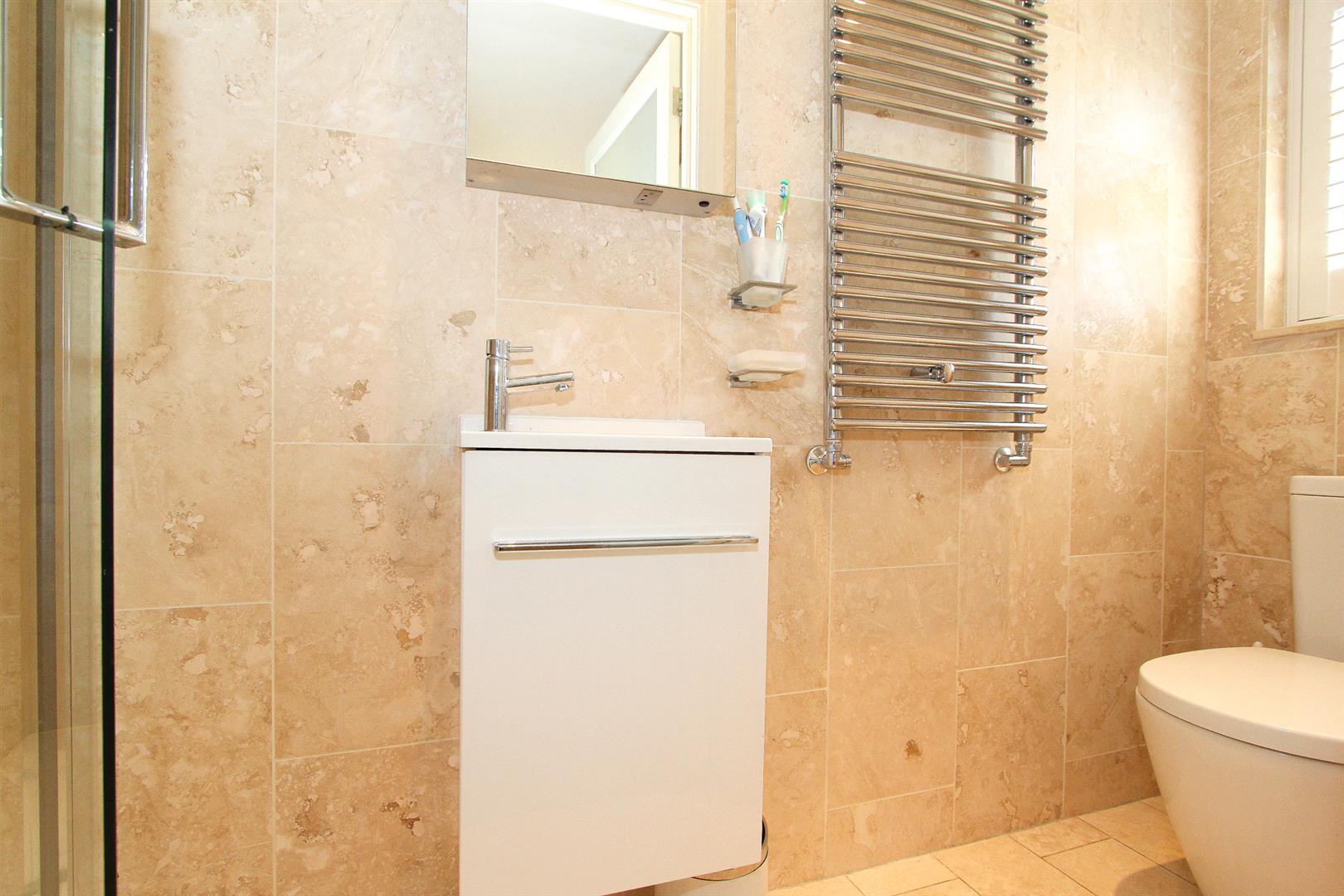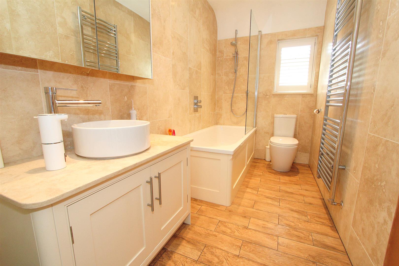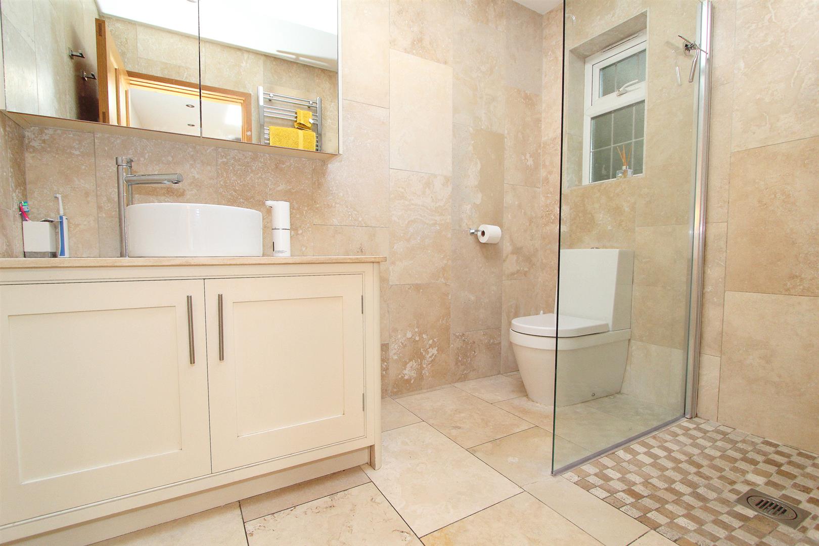Consisting of tiled walk-in cubicle with thermostatic shower and hand attachment, vanity unit with wash hand basin and chrome mixer tap with storage cupboard below, low-level pushbutton flush WC, tiled flooring, tiled walls, heated chrome towel rail, feature skylight and obscure double glazed window to rear aspect.