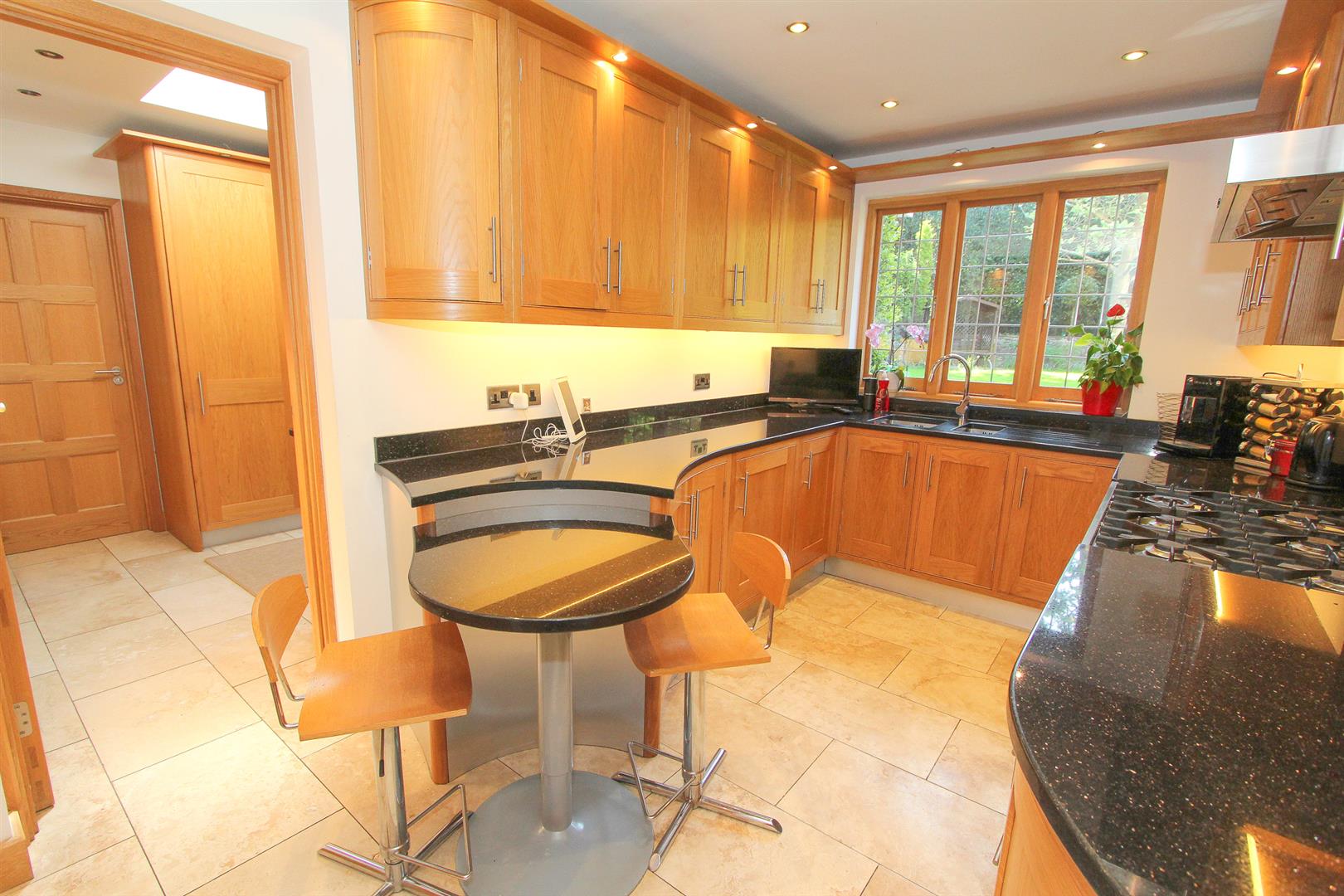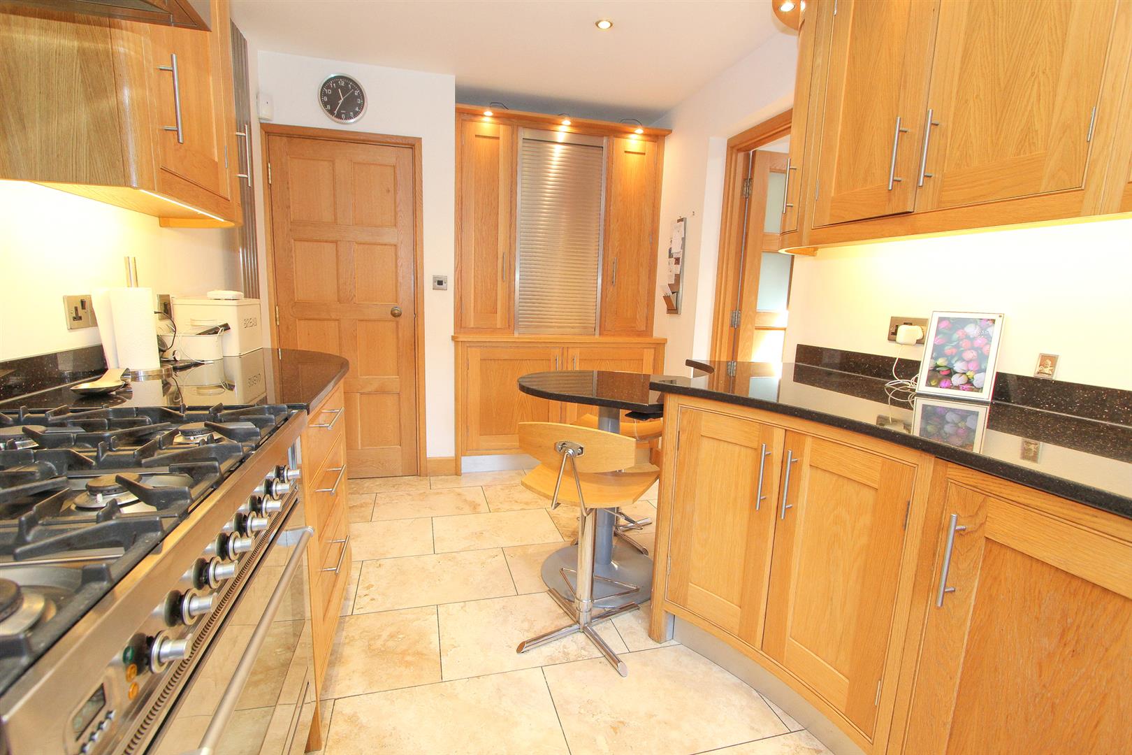 Range of fitted wooden wall units with matching cupboards and drawers below, quartz worktops with inlaid 1 & 1/2 bowl “Franke” stainless steel sink and chrome mixer tap, space for gas range cooker with extractor fan above, integrated fridge, fitted dresser unit with storage cupboards below, breakfast bar area, tiled flooring, double glazed leaded light window to rear aspect, modern radiator.
