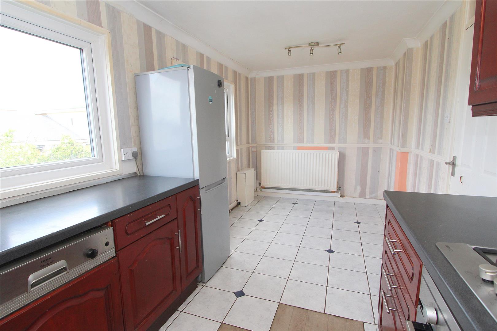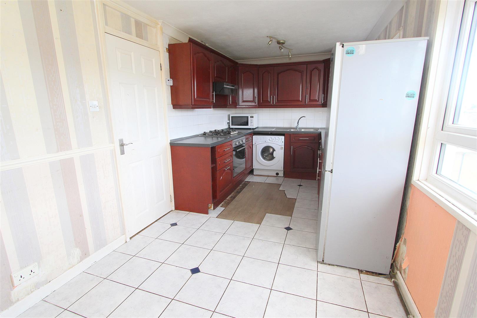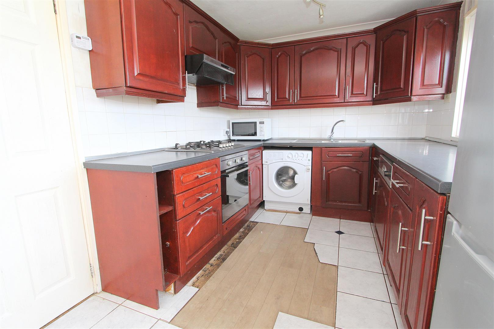Range fitted wooden wall units with matching cupboards and drawers below, granite effect roll top work surfaces with inlaid stainless steel sink and chrome mixer tap, inlaid five ring gas hob with oven/grill below and extractor fan above, integrated dishwasher and washing machine, space for tall standing fridge/freezer, partially tiled flooring, double panel radiator, tiled splashback, coved ceiling, UPVC double glazed windows to front aspect.