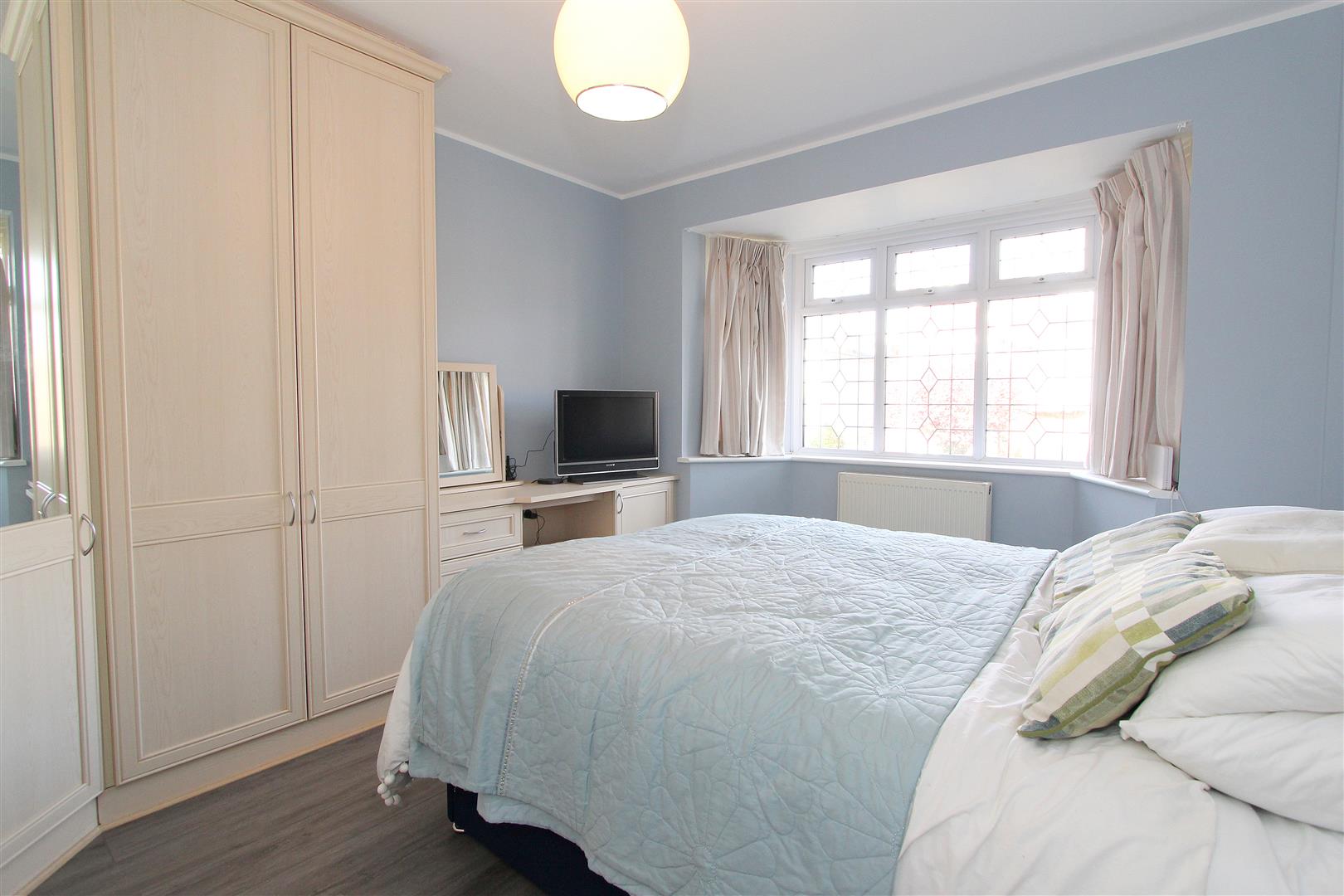 UPVC double glazed leaded light bay window to front aspect, double panel radiator, wood laminate flooring, fitted wardrobes and dressing table.