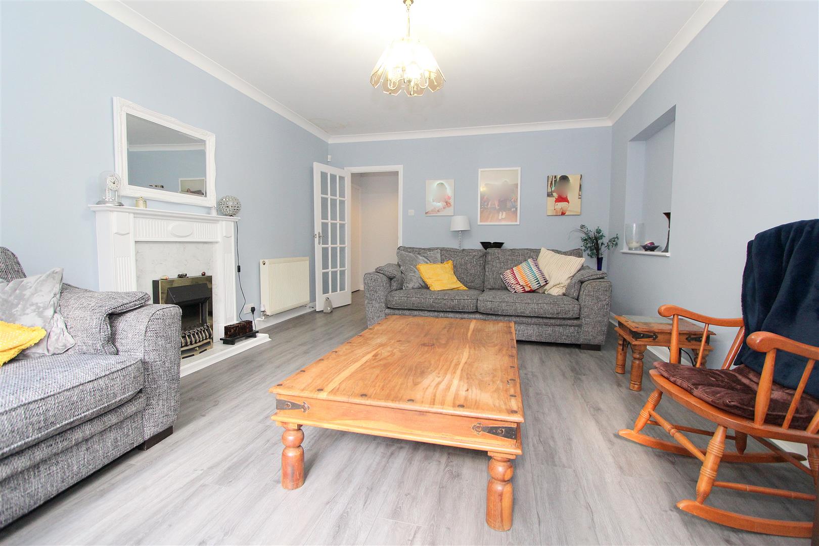 UPVC double glazed window to rear aspect, wood laminate flooring, two double panel radiators, fireplace with wooden mantelpiece, coved ceiling.