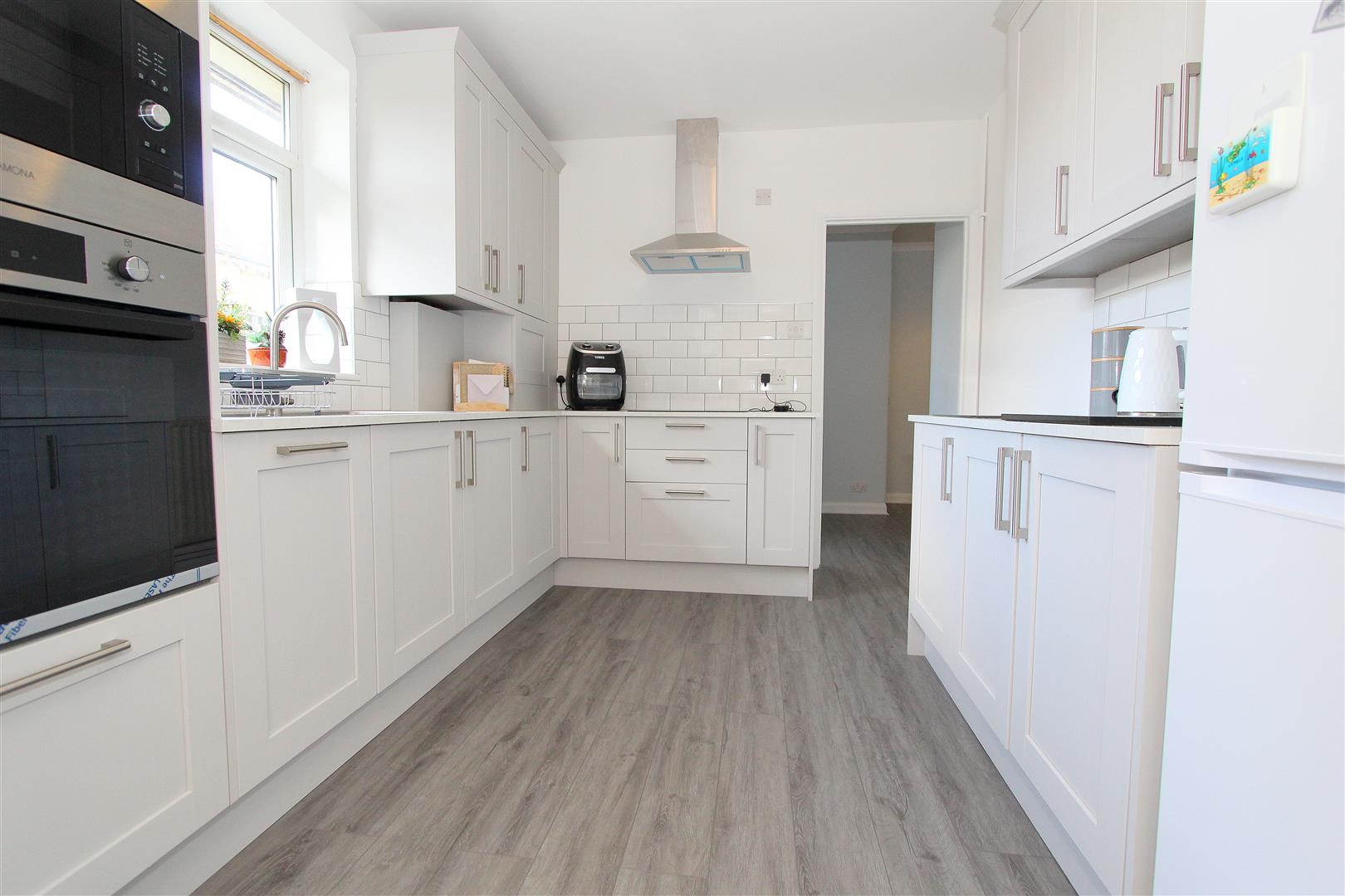 Modern range fitted wall units with matching cupboards and drawers below, marble effect worktops with inlaid stainless steel sink and chrome mixer tap, inlaid induction hob with extract fan above, integrated dishwasher, integrated oven/grill and microwave, space for tall standing fridge/freezer, cupboard housing “Worcester” combination boiler, tiled splash back, single panel radiator, wood laminate flooring, UPVC double glazed window to side aspect.