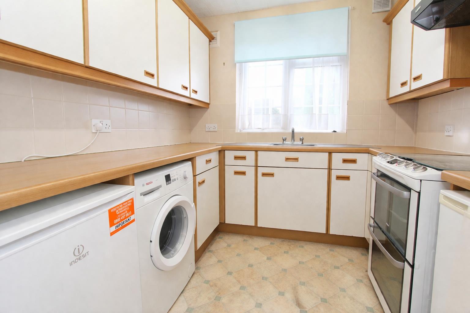 Range of fitted wall units with matching cupboards and drawers below, roll top work surfaces with inlaid stainless steel sink and chrome mixer tap, space for cooker with extractor fan above, space for fridge and freezer, space and plumbing for washing machine, tiled splash back, UPVC double glazed window to rear aspect (overlooking well kept communal grounds).