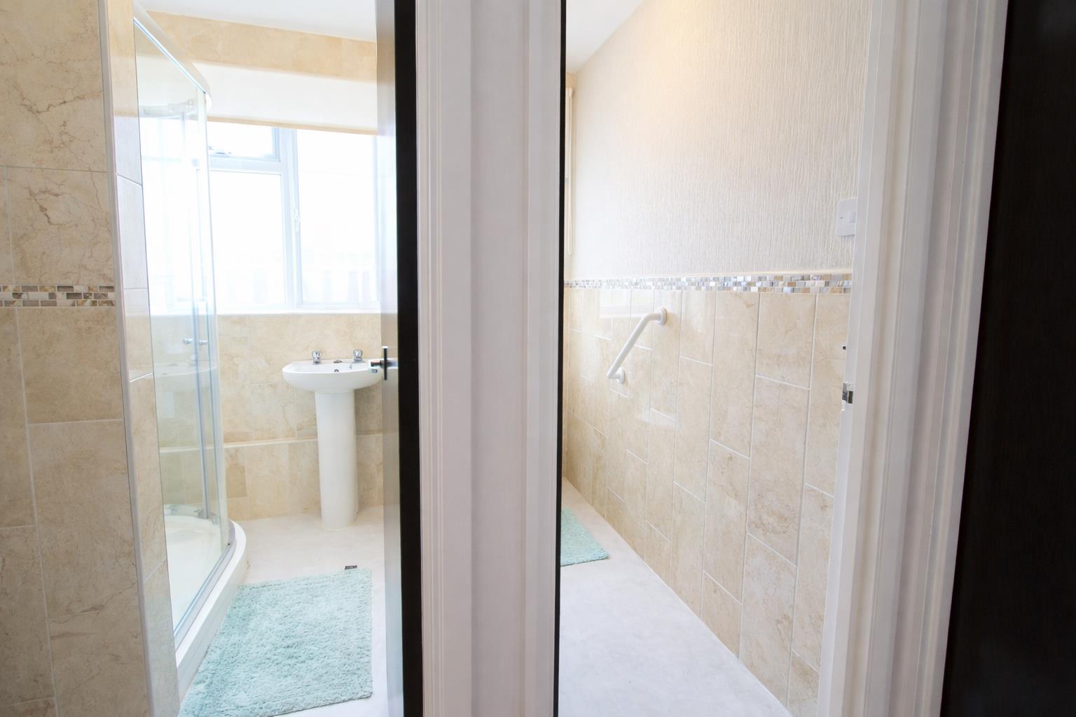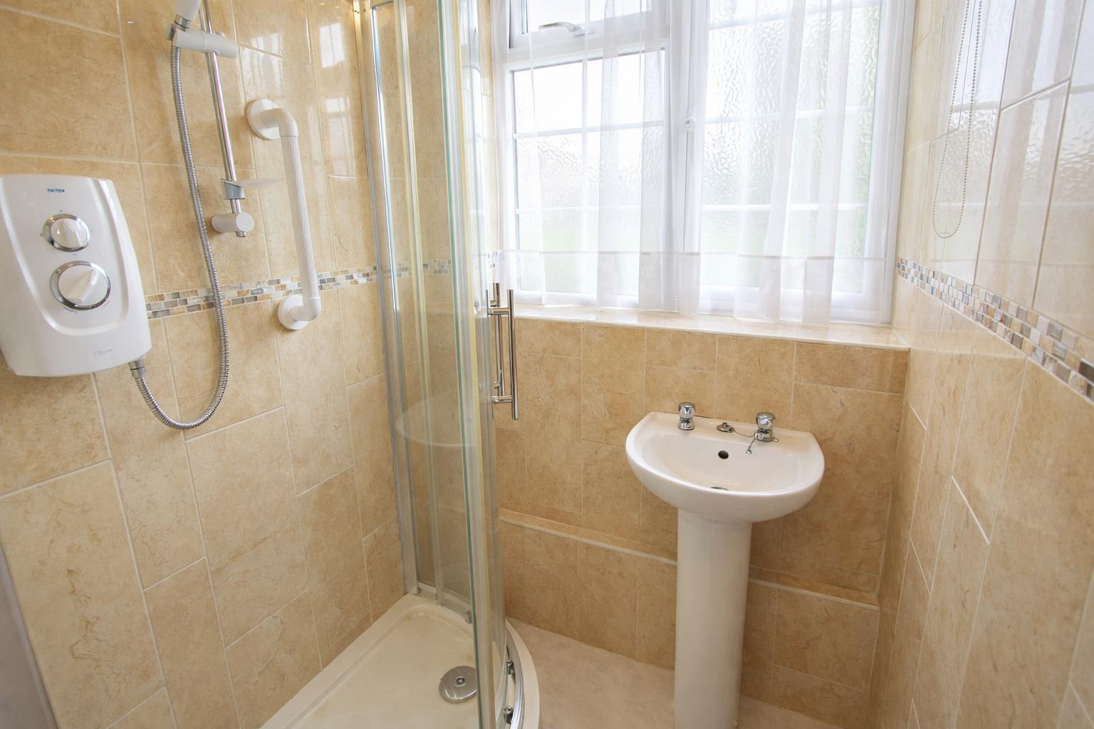 Tiled cubicle with thermostatic shower, pedestal wash hand basin with chrome taps, tiled walls, obscure UPVC double glazed window to rear aspect.