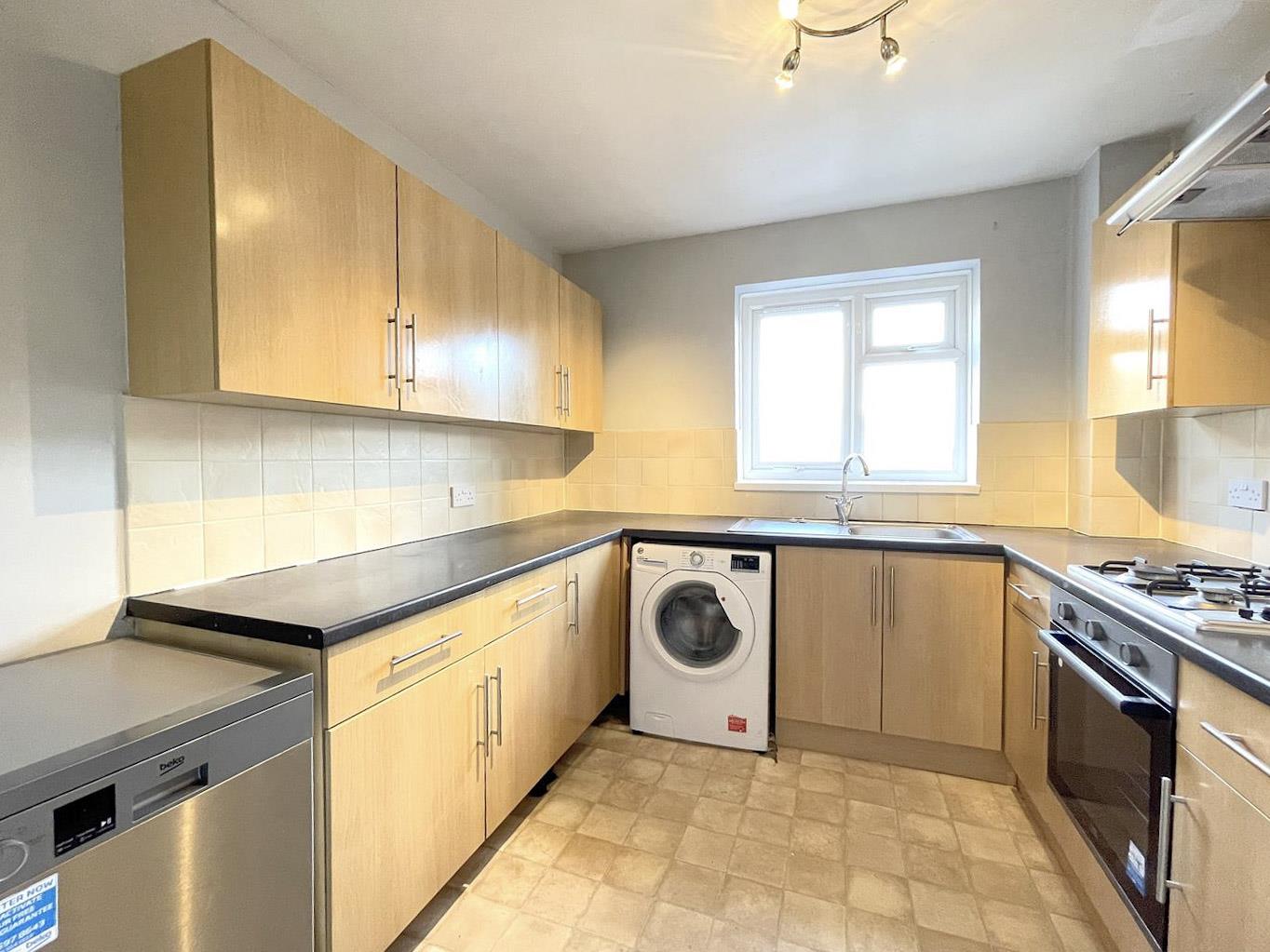 Range of fitted wall units with matching drawers and cupboards below, laminate worktop, part tiled walls, inset sink with chrome mixer tap, includes integrated electric oven with gas hob with built in extractor fan, fridge freezer, dish washer, washing machine. UPVC double glazed window to side aspect, laminate floor.