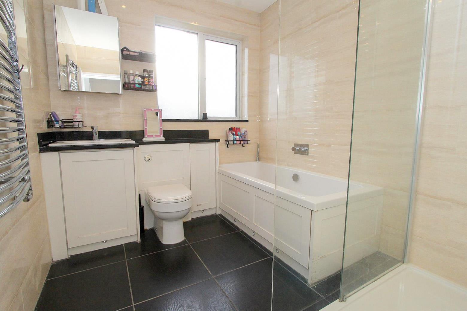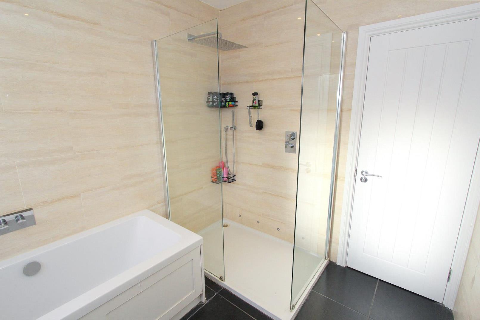 Spacious four piece suite consisting of tiled walk in cubicle with thermostatic shower and hand shower attachment, panel enclosed bath with chrome mixer tap and hand shower attachment, vanity unit with wash hand basin, chrome mixer tap with low-level push button flush WC at side, tiled flooring, tiled walls, extractor fan, integrated speaker system, heated chrome towel rail, obscure UPVC double glazed window to rear aspect.