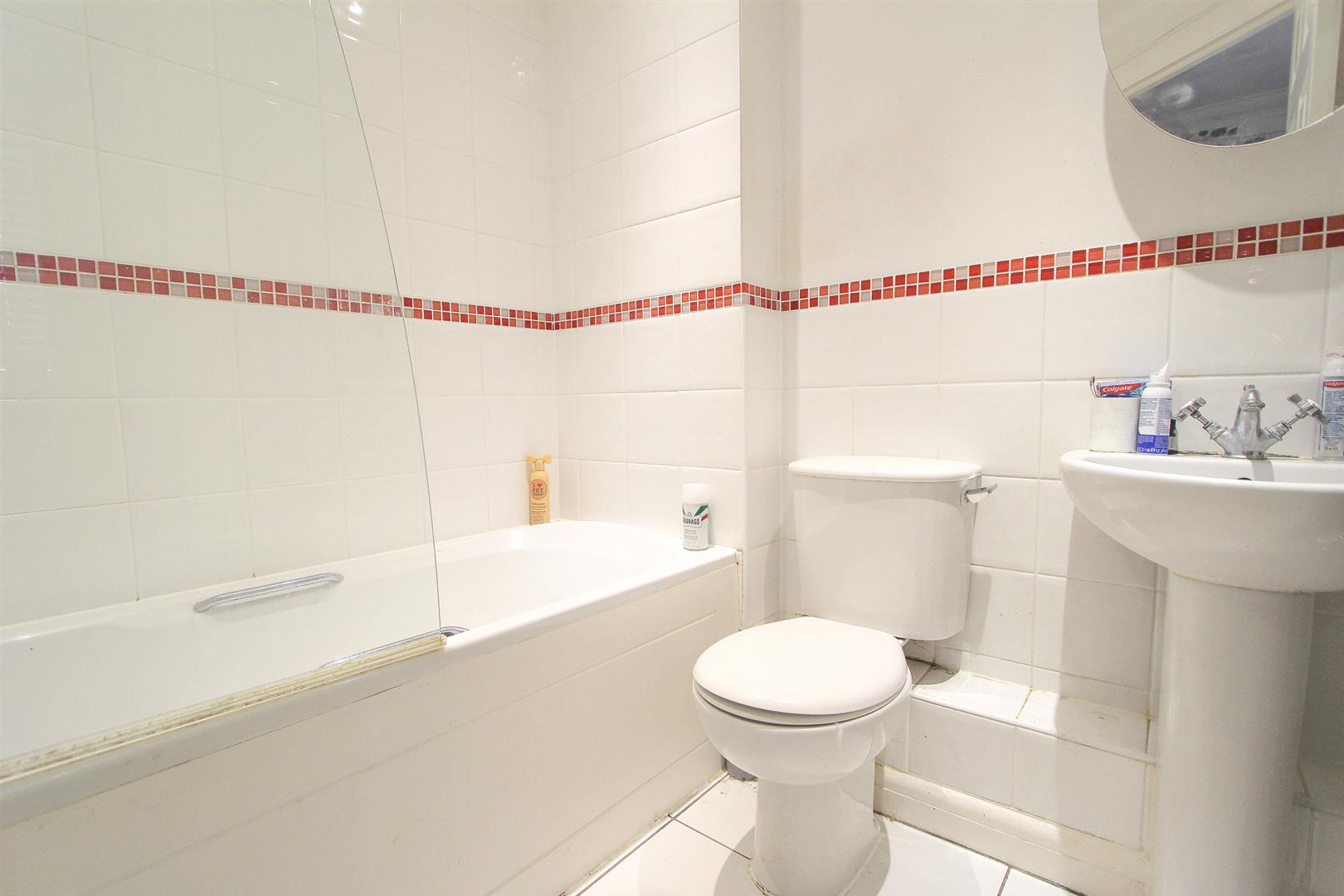 Three-piece suite comprising panel enclosed bath with Victorian style chrome mixer tap and shower attachment, pedestal wash hand basin with chrome mixer tap, low-level flush WC, heated chrome towel rail, tiled flooring, part tiled walls, shaver point.