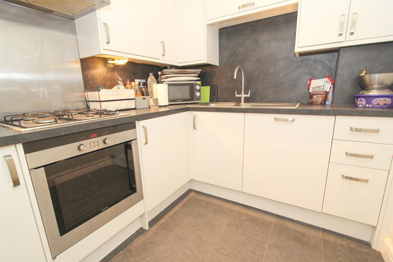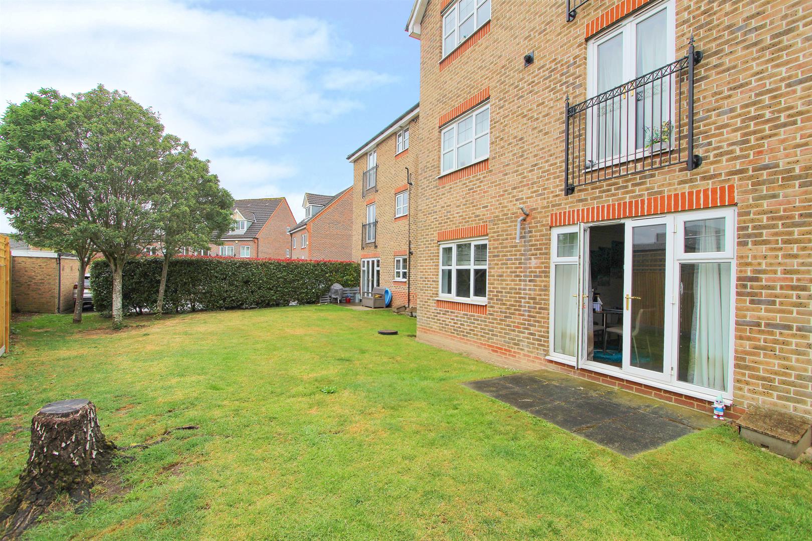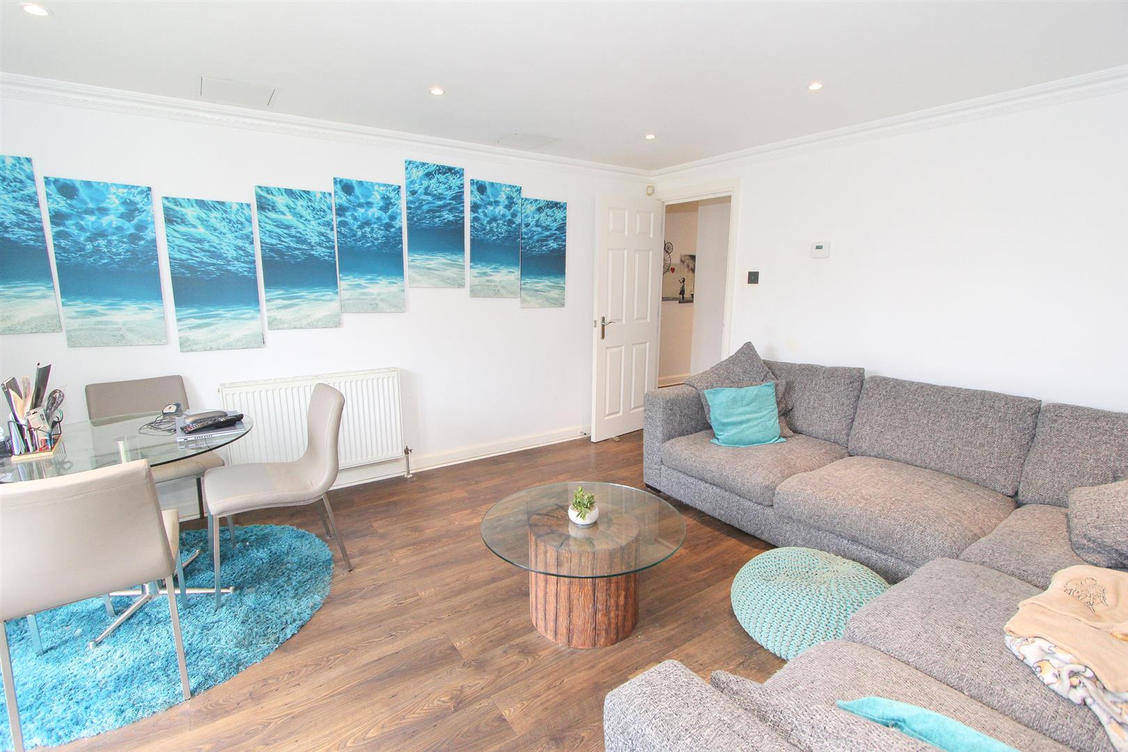 UPVC double glazed patio doors to rear aspect with patio area and well-kept communal grounds, wood laminate flooring, double panel radiator, decorative coved ceiling, wall mounted digital thermostat.
