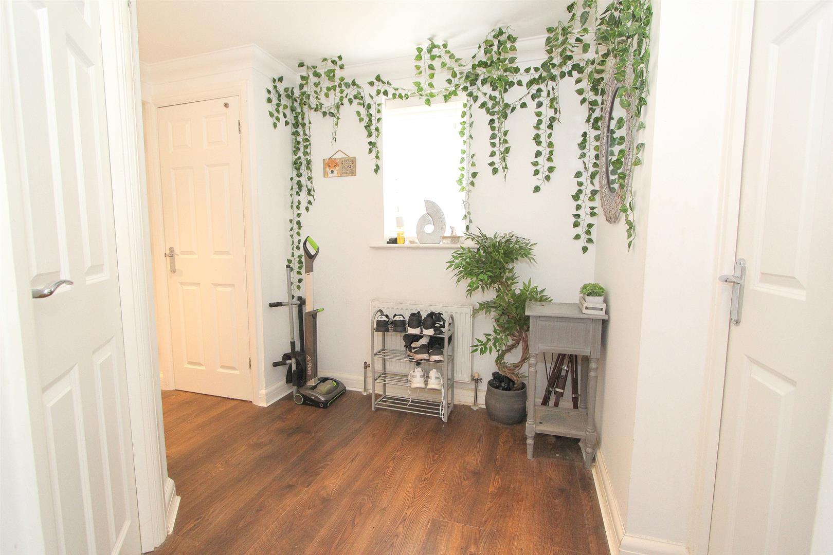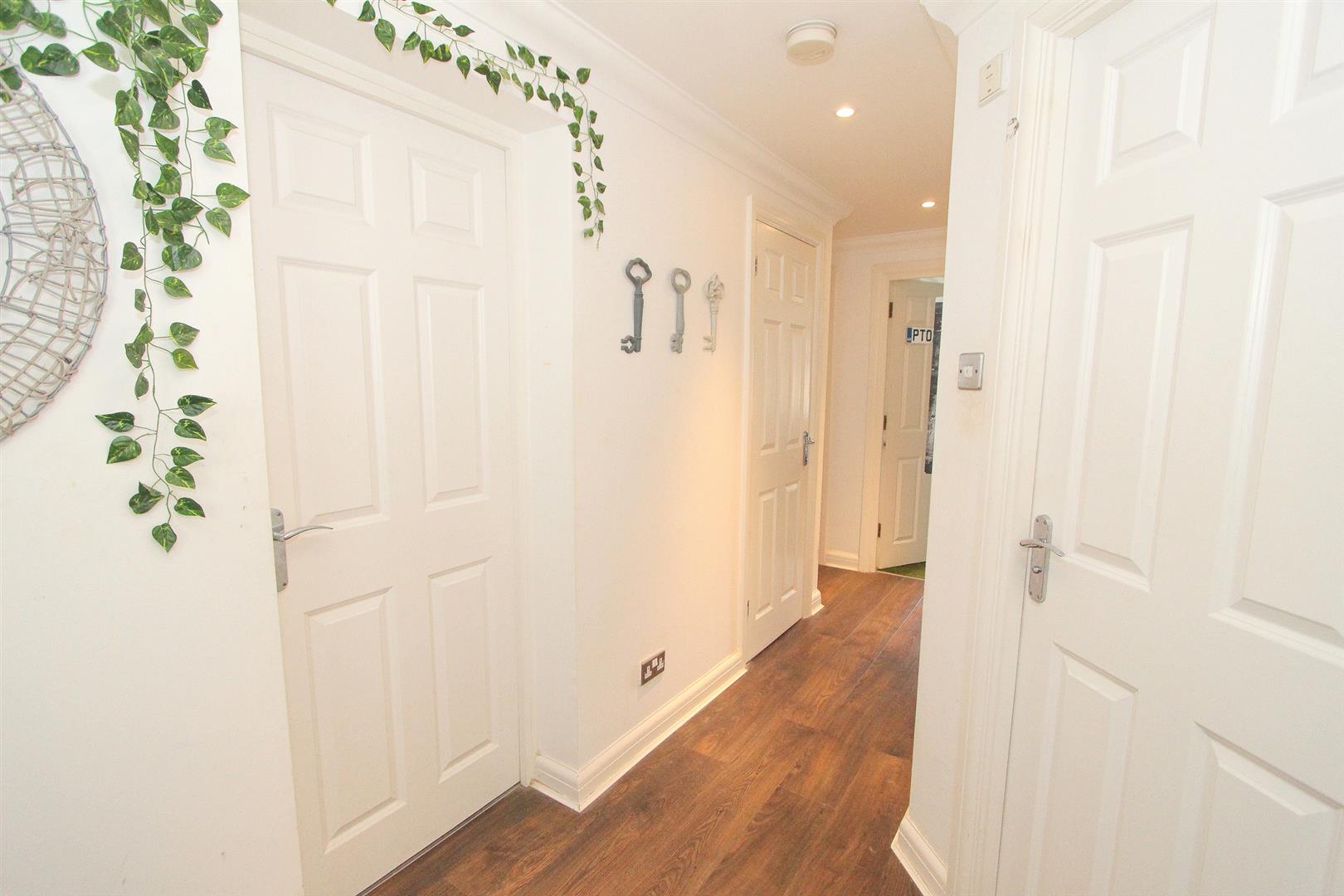 UPVC double glazed window to front aspect, wood laminate flooring, single panel radiator, coved ceiling, two storage cupboards one housing hot water tank, wall mounted entry phone.