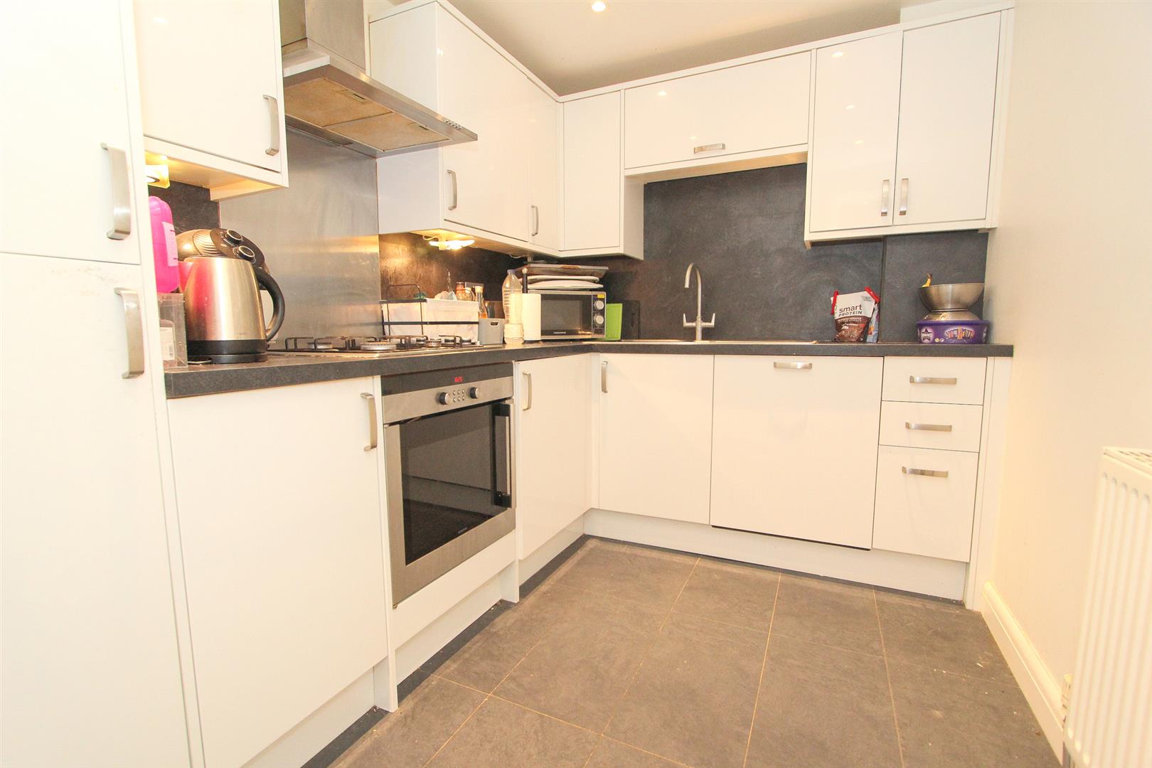 Range of fitted wall units with matching cupboards and drawers below, granite effect worktops with inlaid stainless-steel sink and brushed chrome mixer tap, inlaid gas hob with oven/grill below and extractor fan above, integrated dishwasher and washing machine, integrated fridge/freezer, tiled effect flooring, single panel radiator.