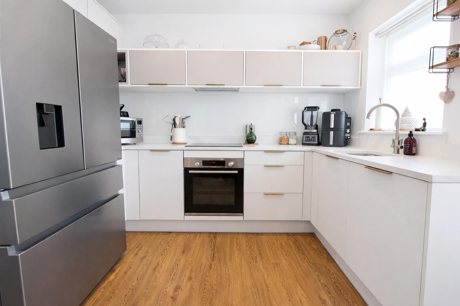 A fitted kitchen by Wren Kitchens offering contemporary white matt base cupboards and drawers, paired with cashmere-tone overhead cupboards with underlighting. Integrated appliances include an electric Bosch oven and induction hob, as well as a Bosch dishwasher, with additional space for an American-style fridge freezer. Quartz work surfaces complement the units and incorporate a built-in sink with a food waste disposer, filtered water system and a Franke mixer tap, completed with a glass splashback.