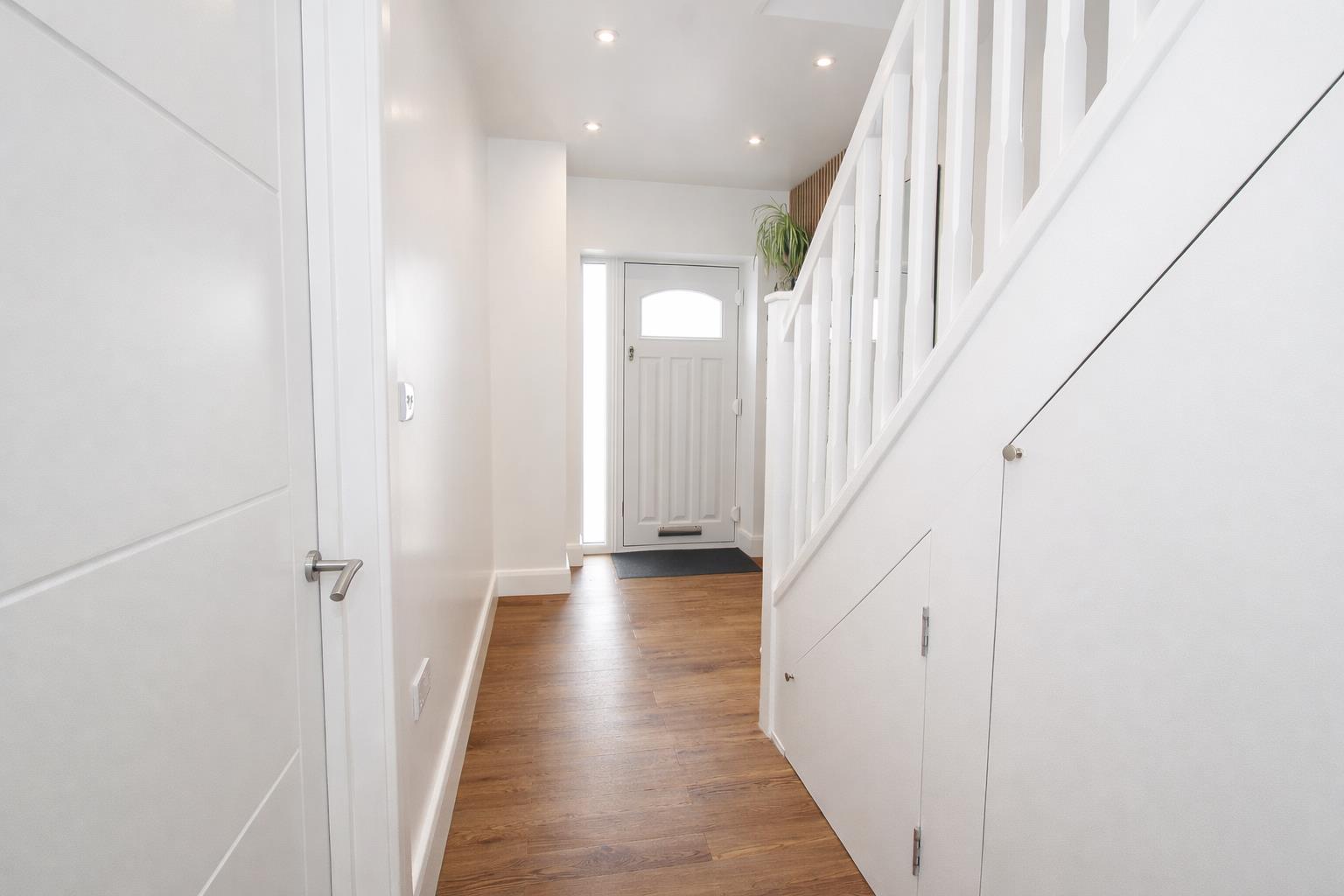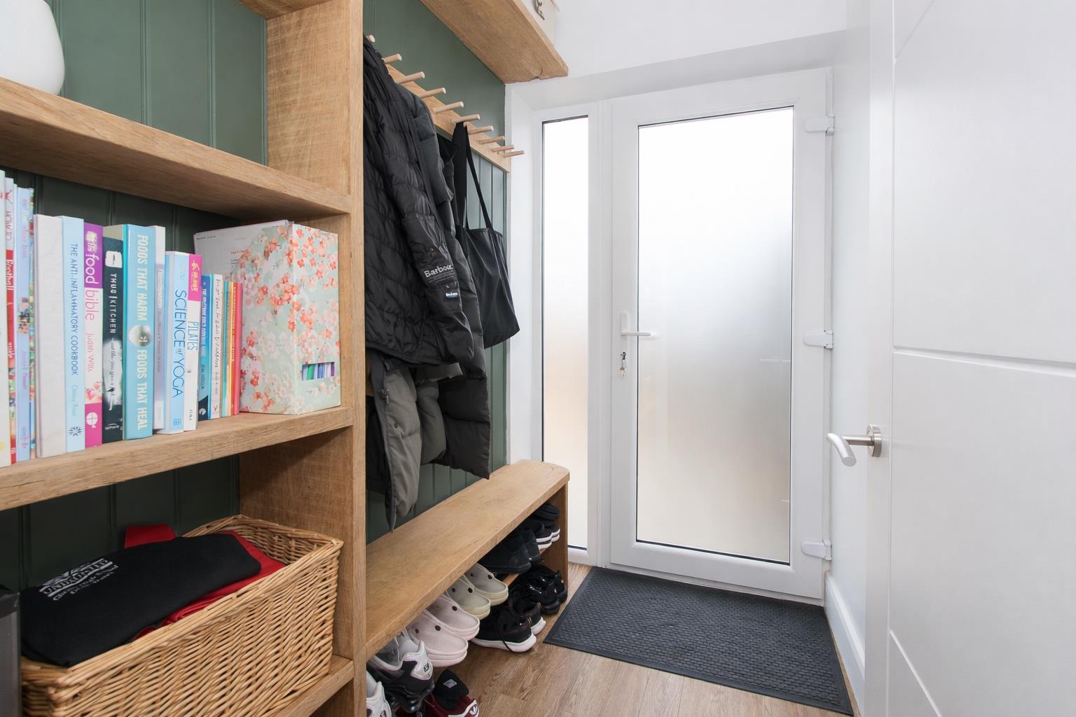 A boot room leading to the garden and features a bespoke solid-oak built-in storage unit to the left-hand side. A double-glazed UPVC door with high-security multifunctional locking system and a glass side panel, providing natural light. Completed with downlights, underfloor heating and plug points.