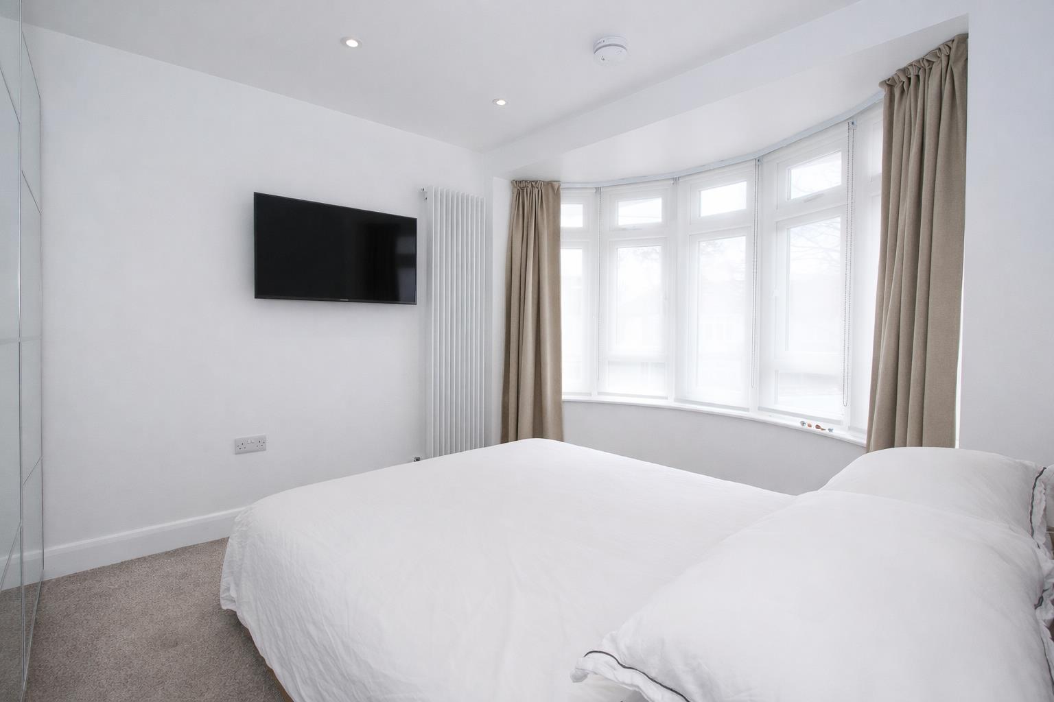 The master bedroom is a spacious room featuring a large, fitted wardrobe, carpeted in grey and a vertical wall-mounted radiator. A large arched bay with double-glazed windows allows for an abundance of natural light. The lighting is controlled via a downlight dimmer switch. There are four plug sockets two of which are USB-C charging ports. There is also a data cable and ariel point.