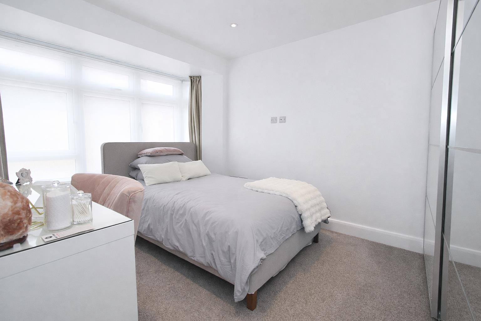 Bedroom two features a bay double-glazed window with a radiator positioned beneath. The room also benefits from a large, fitted wardrobe and is finished with grey carpet. The Lighting is controlled via a downlight dimmer switch. There are plug sockets with USB-C charging ports. There is also a data cable and ariel point.