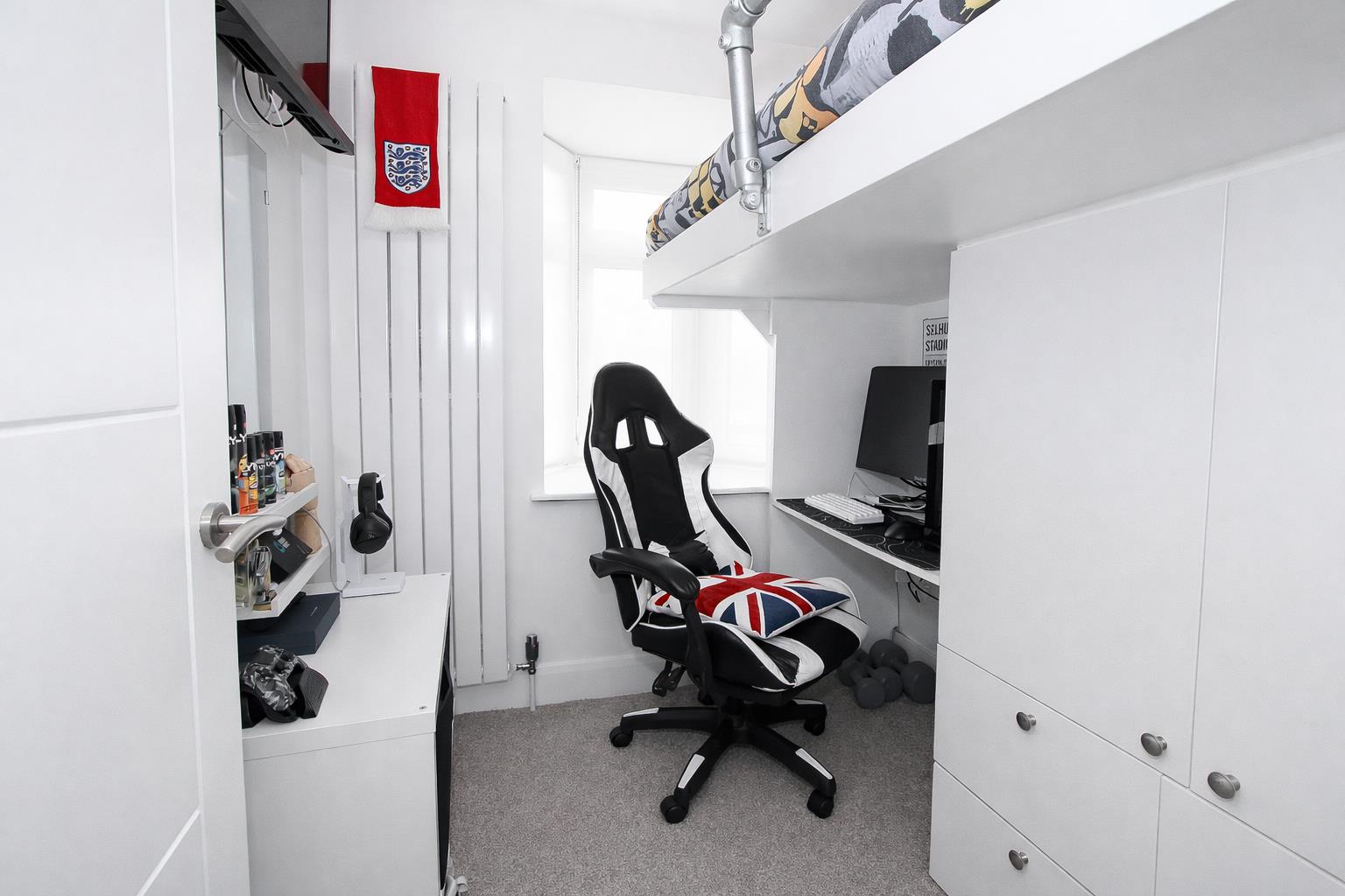 Bedroom three benefits from a double-glazed arched-bay window, a vertical wall-mounted radiator and grey carpeting. The room also features a built-in bed with integrated storage units and a computer workspace beneath. There are ample plug sockets, a USB-C port, data cable and an ariel point.
