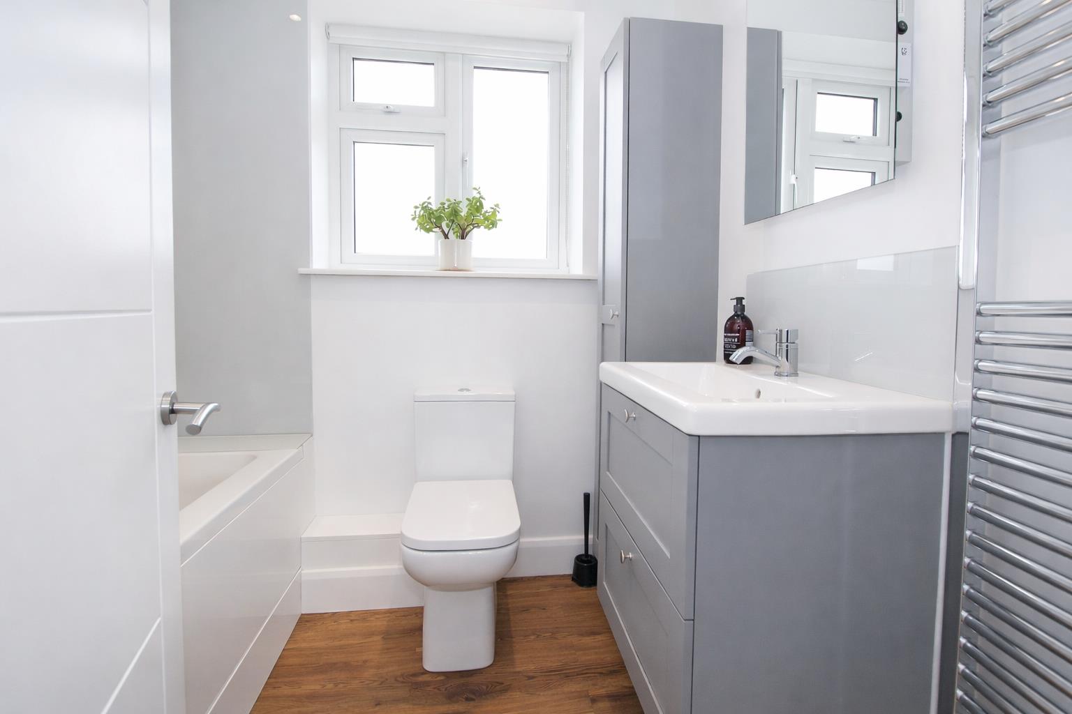 The family bathroom has attractive bevel line hard wearing rich oak-effect flooring and comprises a low-level WC with pushbutton, a bath with a glass surround splashback and a glass fitted shower screen. A large round rainfall shower head with an additional handheld attachment is fitted above, along with chrome mixer controls.