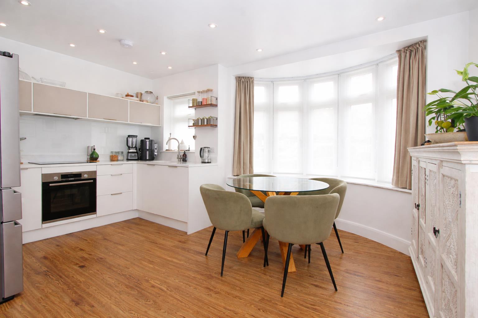 The open-plan kitchen space is completed with attractive bevel line hard wearing rich oak-effect flooring and features an attractive arched bay window with double-glazed windows.