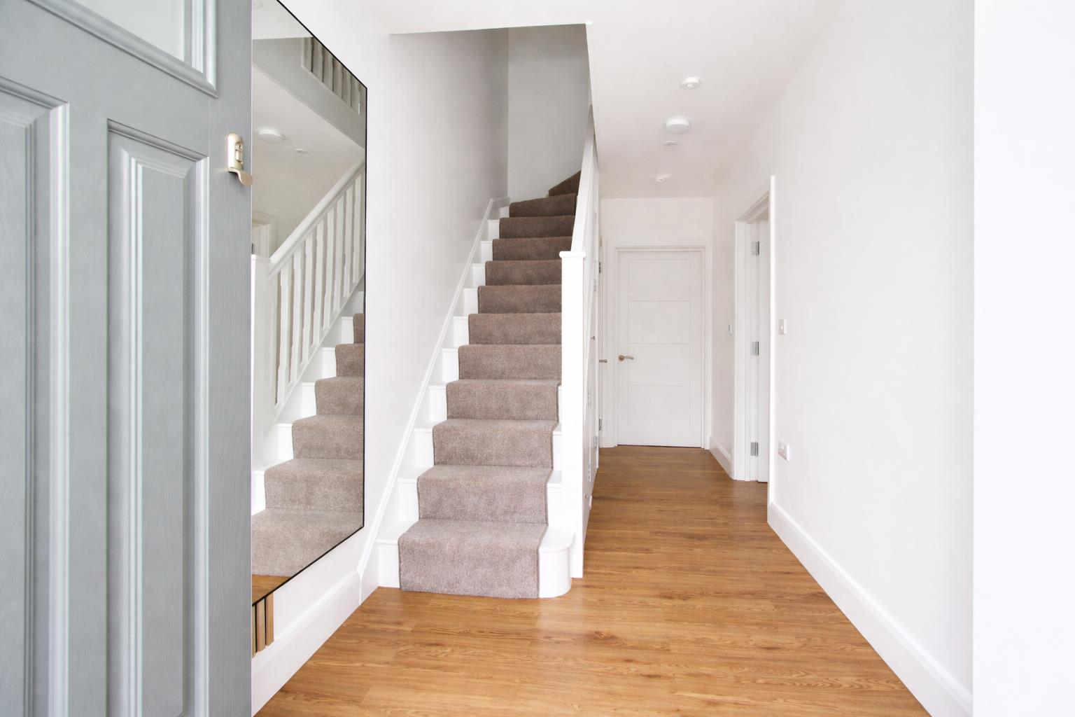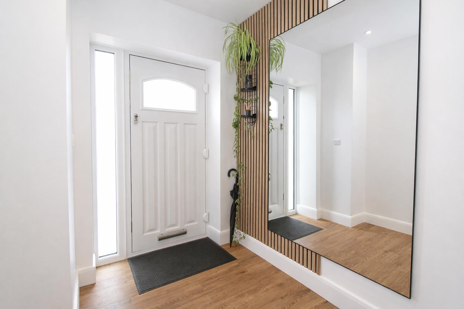 The entrance hall features attractive bevel line hard wearing rich oak-effect flooring and a decorative wooden panelled feature wall with a mirror positioned to the left-hand side. A staircase with wooden balustrades and a carpeted runner leads to the first floor. There are three useful storage cupboards, one of which houses the Samsung Air Source Heat Pump with an impressive energy rating of A+++. Ample downlighting and underfloor heating.