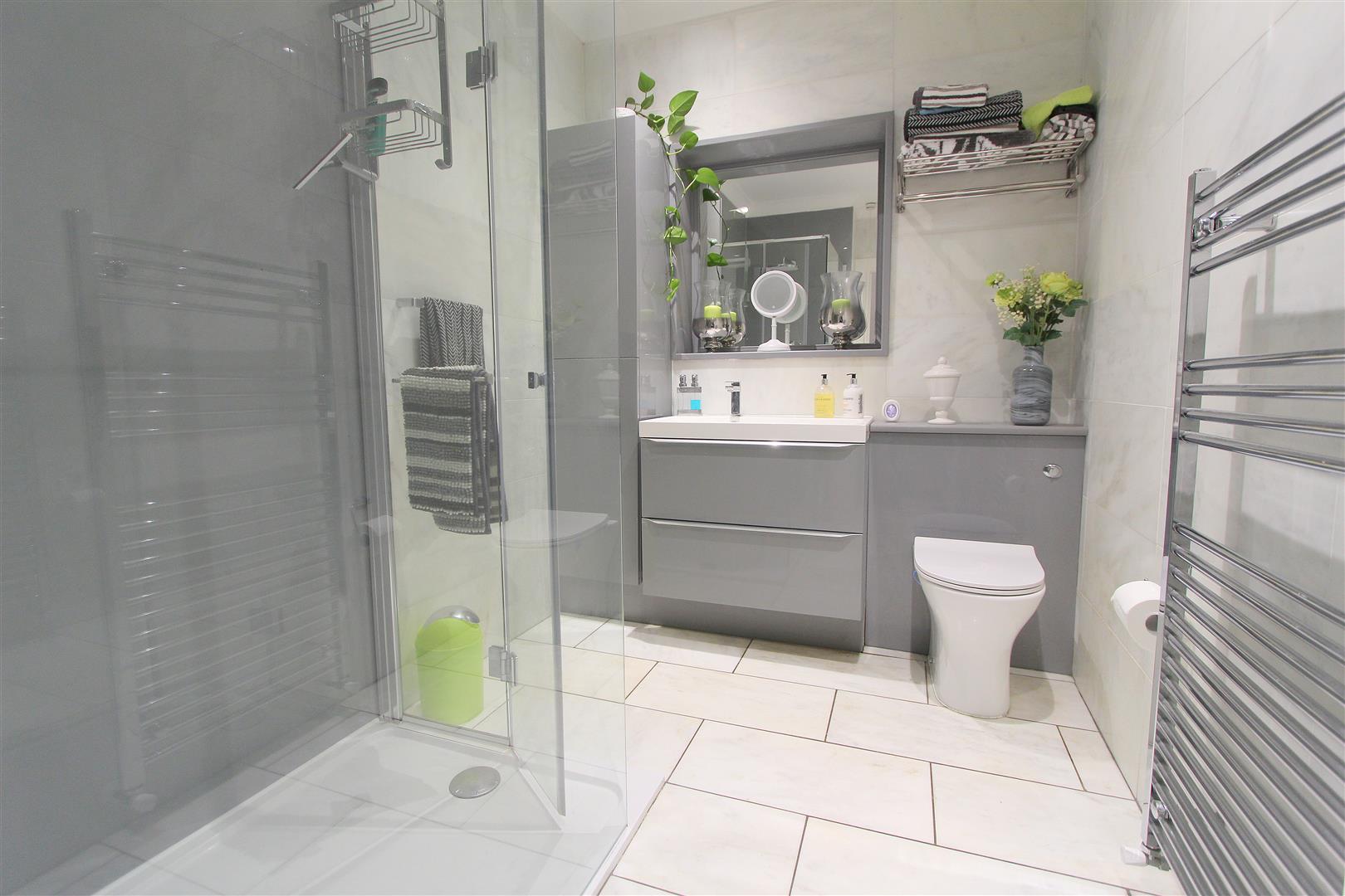 Modern suite consisting of panelled walk in cubicle with thermostatic shower, wash hand basin with chrome mixer tap and storage cupboard below, low-level push button flush WC, heated chrome towel rail, tiled flooring, tiled walls, coved ceiling, extractor fan.