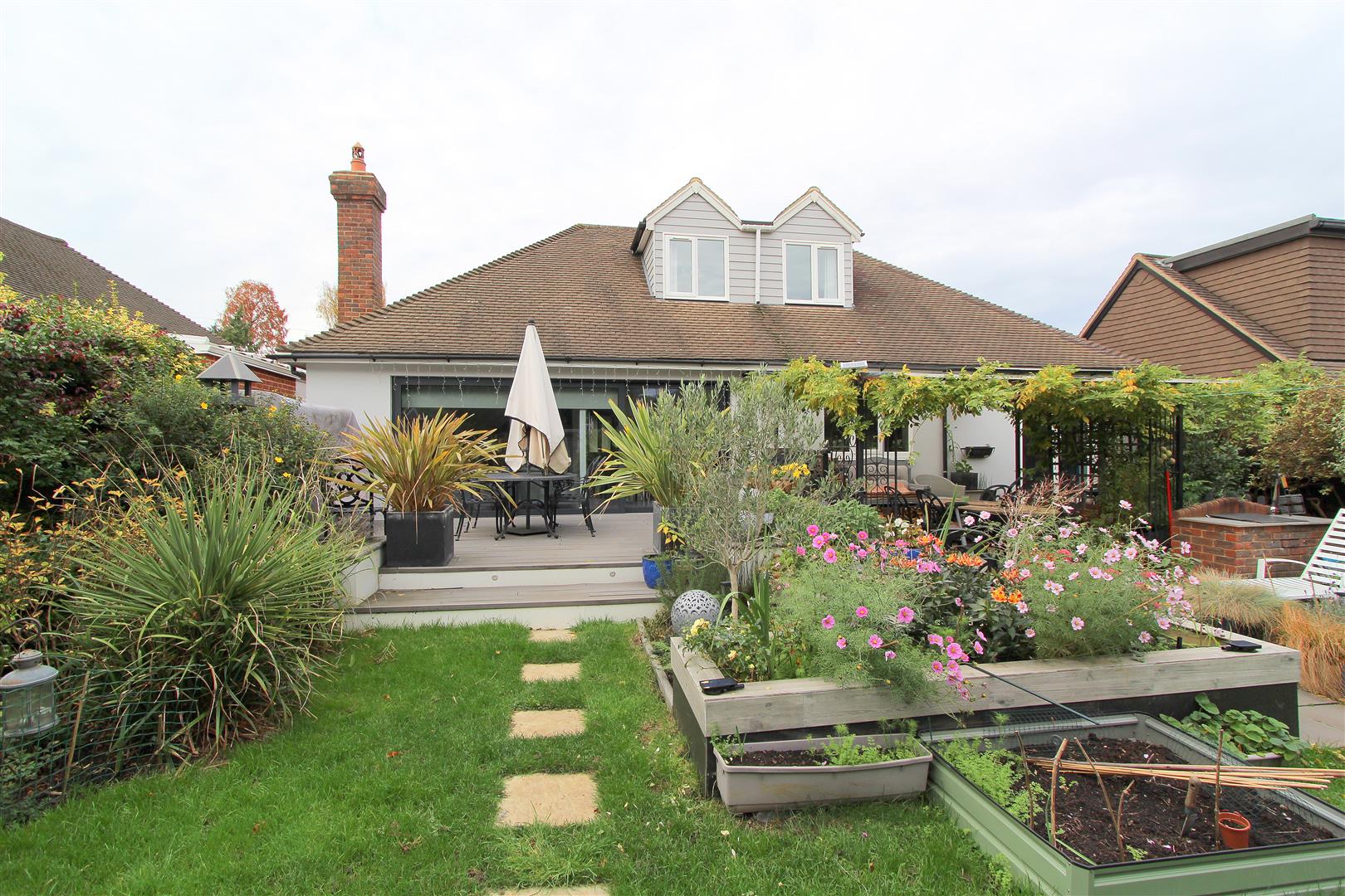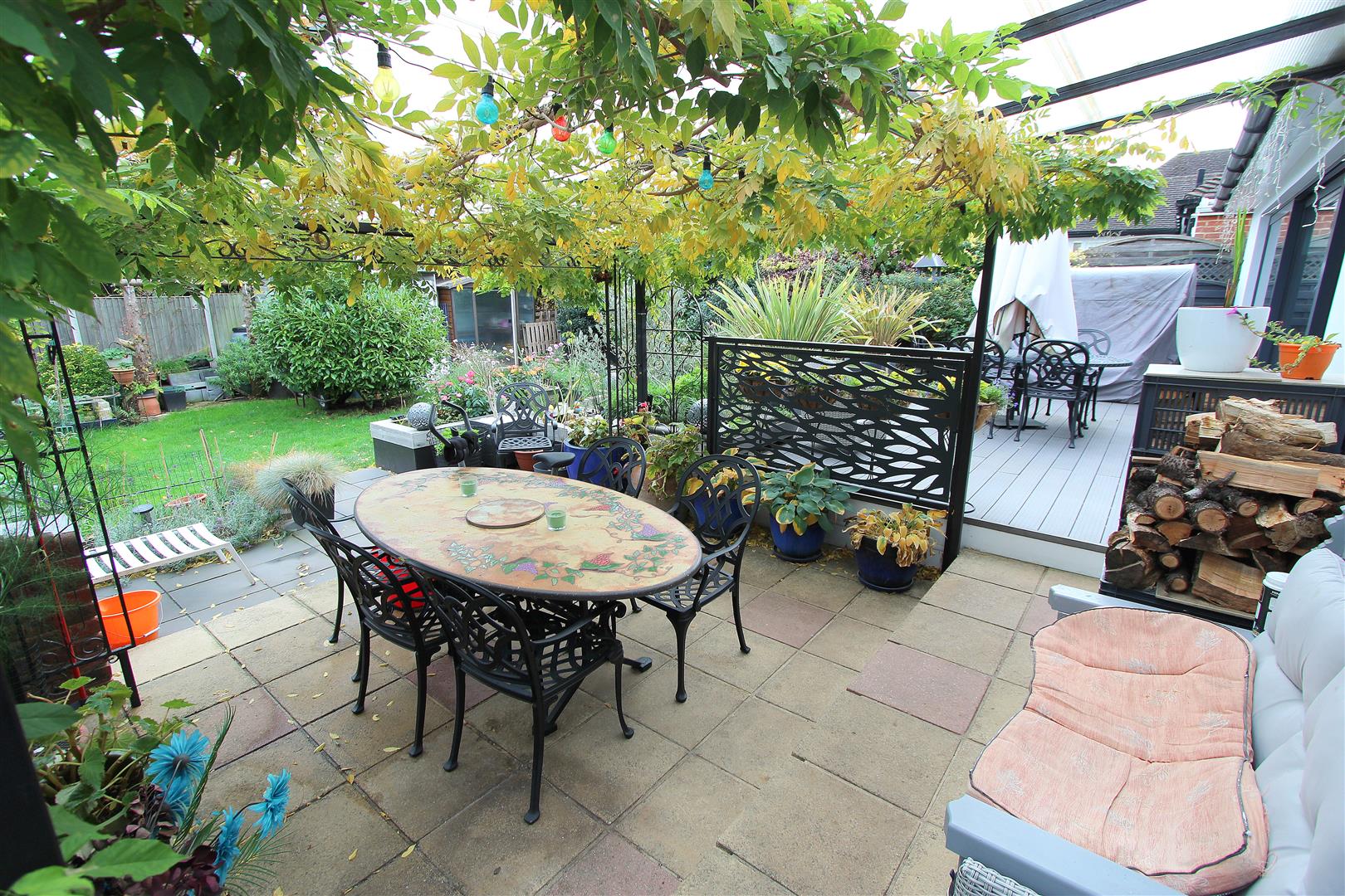 Pretty landscaped rear garden with an abundance of flowerbeds and shrubs bordering, sheltered seating area, composite decking and patio sections, storage and garden shed, outside water supply, fence enclosed, fish pond.