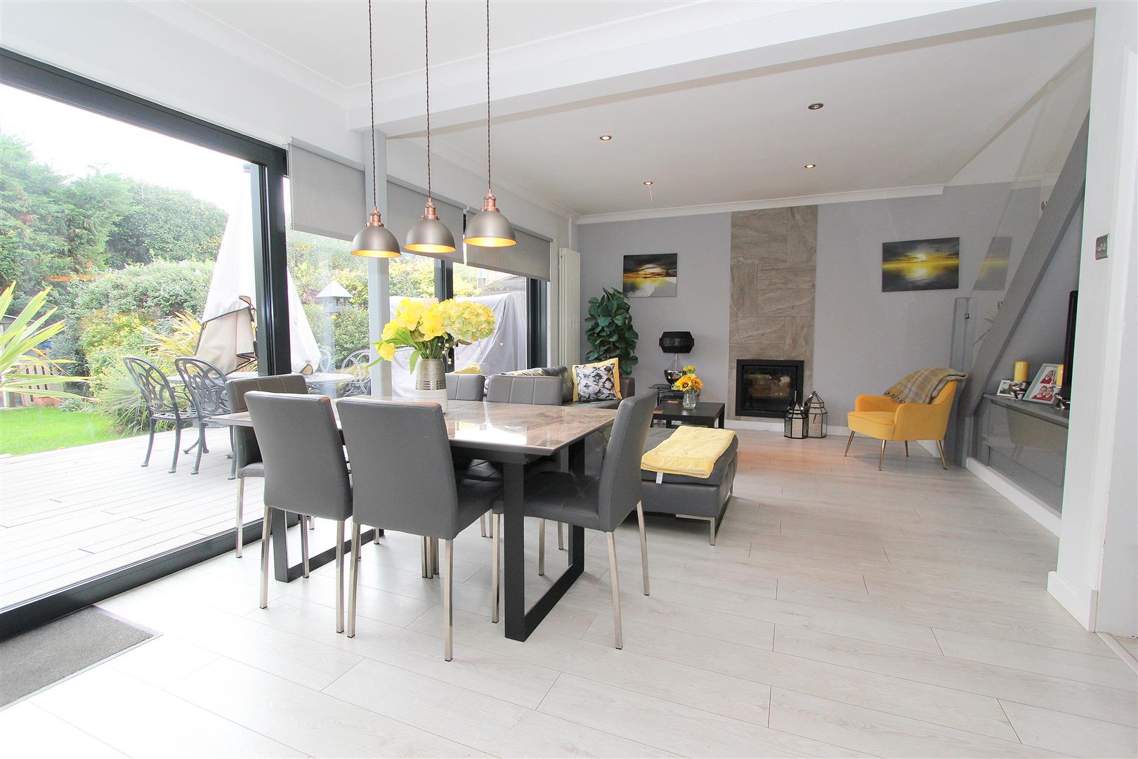 Large double glazed sliding doors to rear aspect, wood flooring, feature log burner, modern radiator, coved ceiling, fitted shelving and storage cupboards.