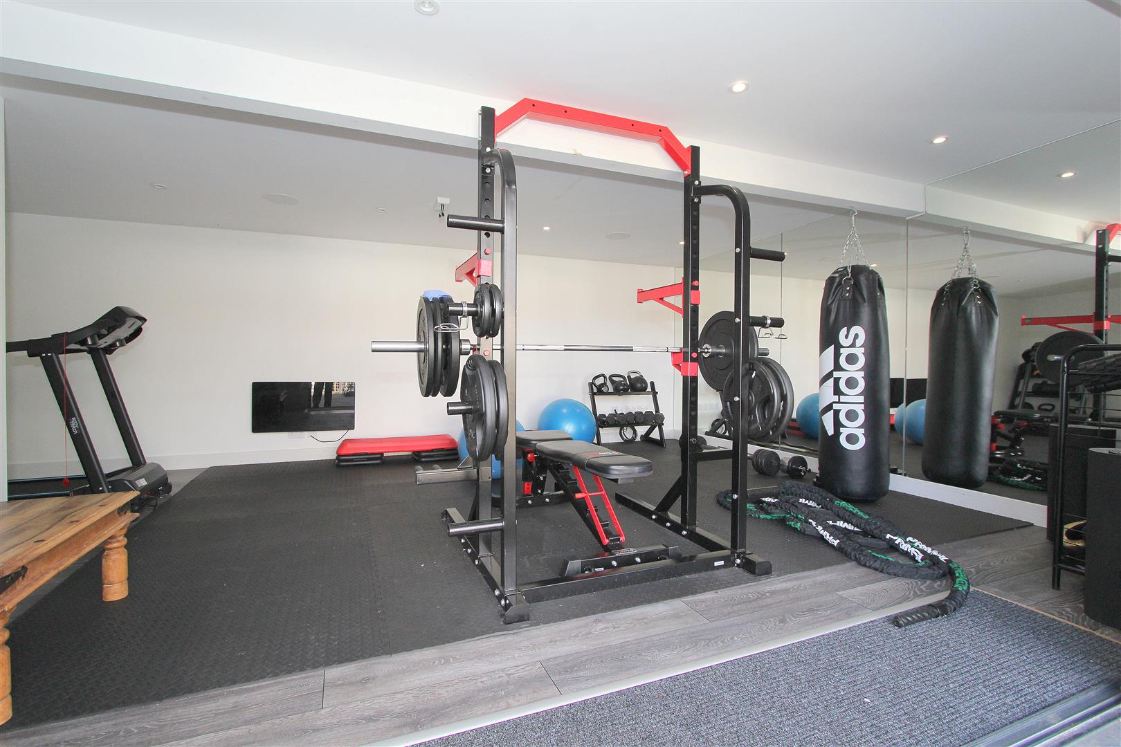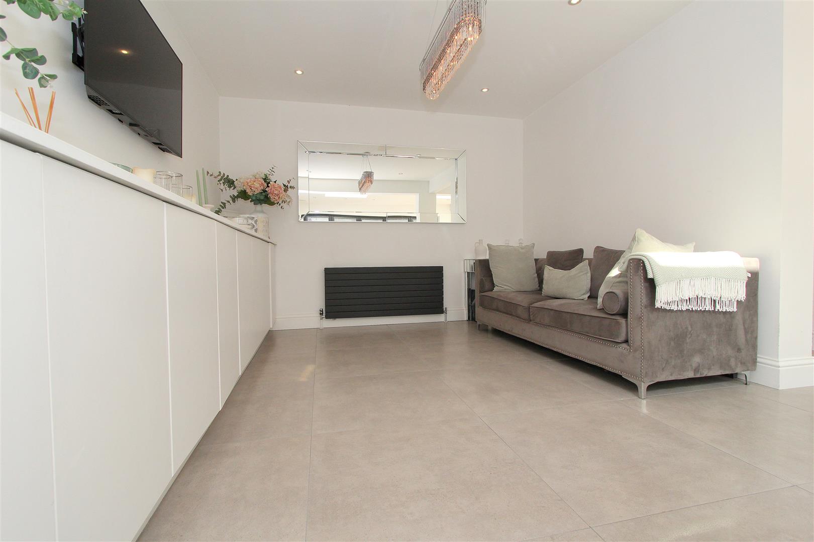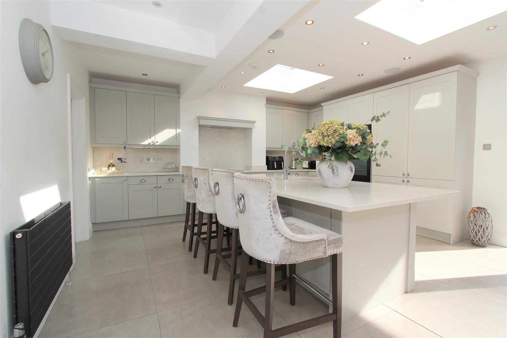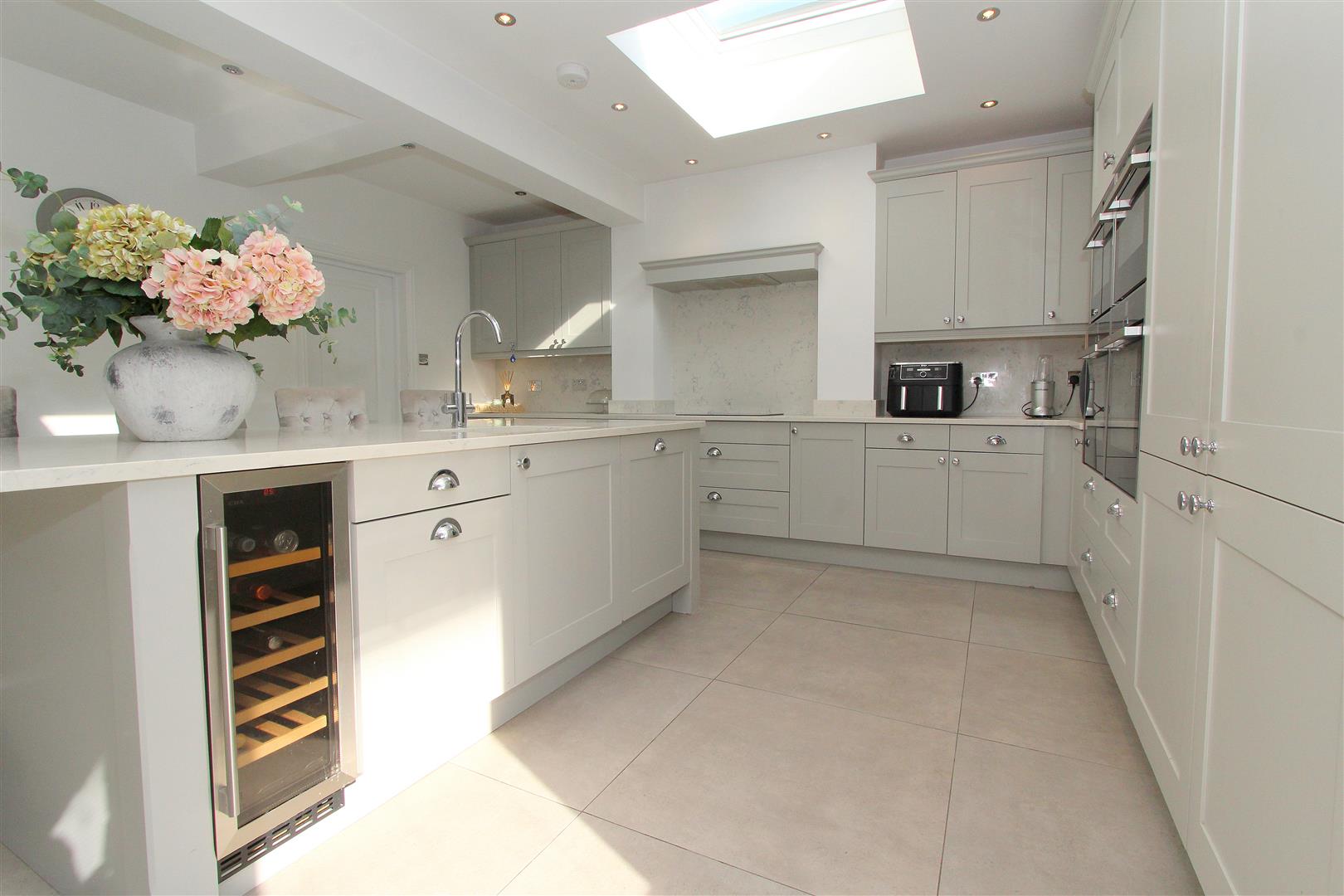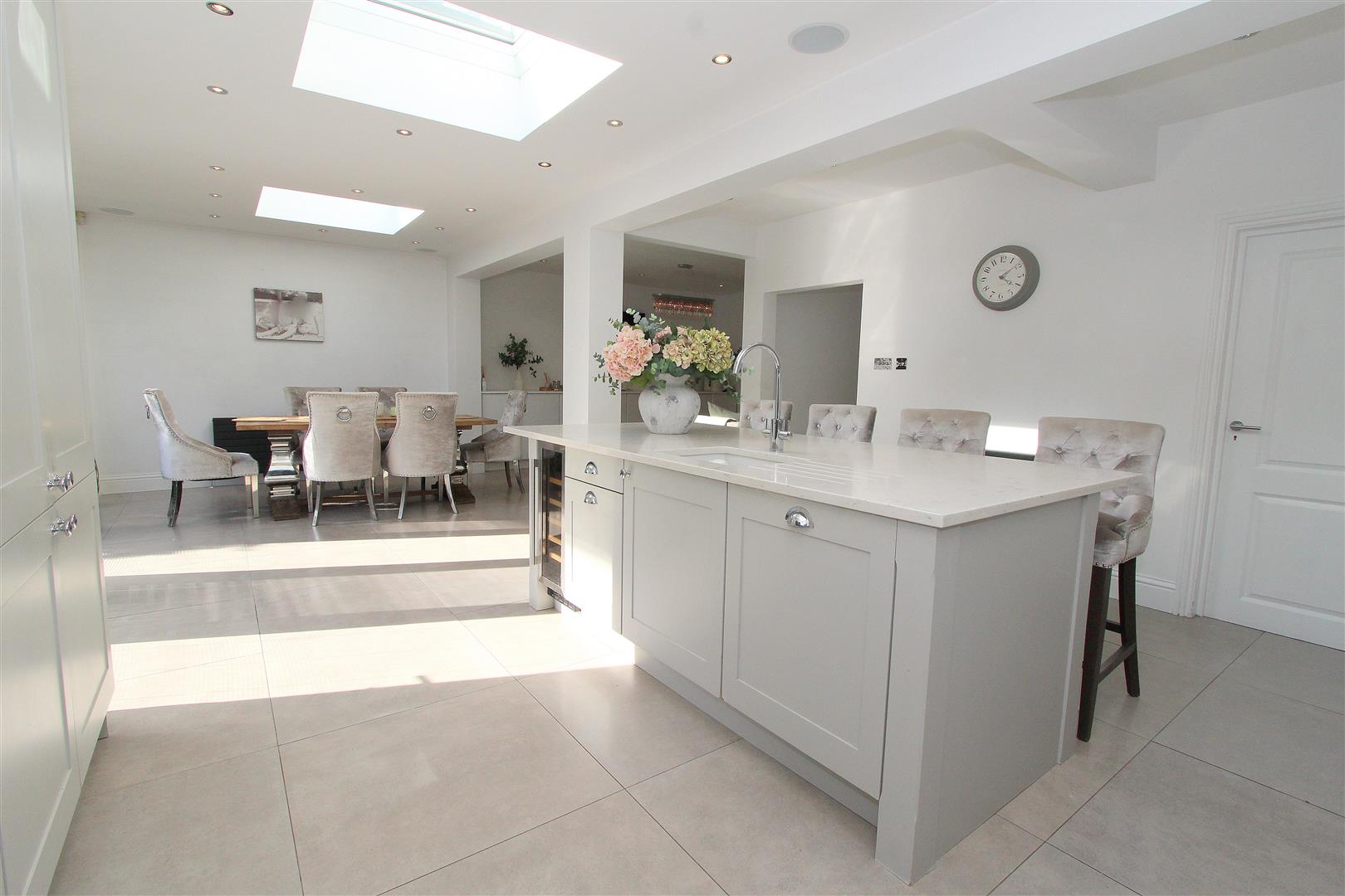 Range of fitted wall units with matching cupboards and drawers below, worktops with inlaid induction hob and extractor fan above, integrated double oven/grill/microwave, integrated fridge/freezer, integrated wine cooler, spacious island with inlaid sink and chrome mixer tap, integrated dishwasher, integrated speaker system, three feature skylights and double glazed bi-folding doors to rear aspect, tiled flooring with underfloor heating.
