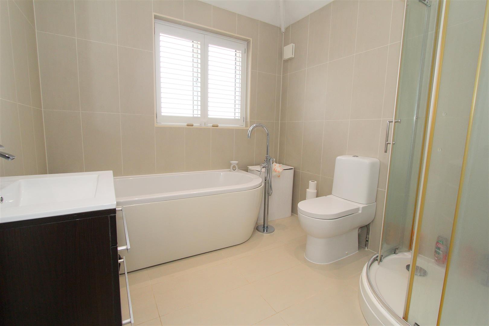 Modern four piece suite comprising panel enclosed bath with chrome mixer tap and shower attachment, tiled cubicle with thermostatic shower, wash hand basin with chrome mixer tap and storage cupboard below, low-level push button flush WC, heated chrome towel rail, tiled walls, tiled flooring, extractor fan, obscure UPVC double glazed window to front aspect, fitted plantation shutters.