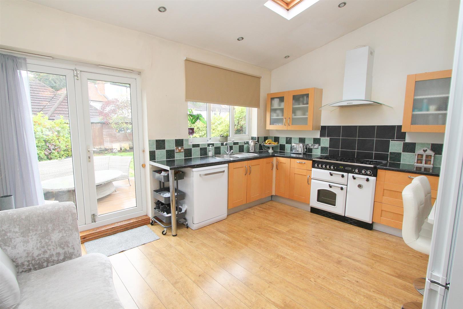 Range of fitted wall units with matching cupboards and drawers below, granite effect roll top work surfaces with inlaid stainless steel sink and chrome mixer tap, space for large gas range cooker with extractor fan above, space and plumbing for dishwasher, space for tall standing fridge/freezer, breakfast bar area, UPVC double glazed windows and French doors to rear aspect, two Velux windows.