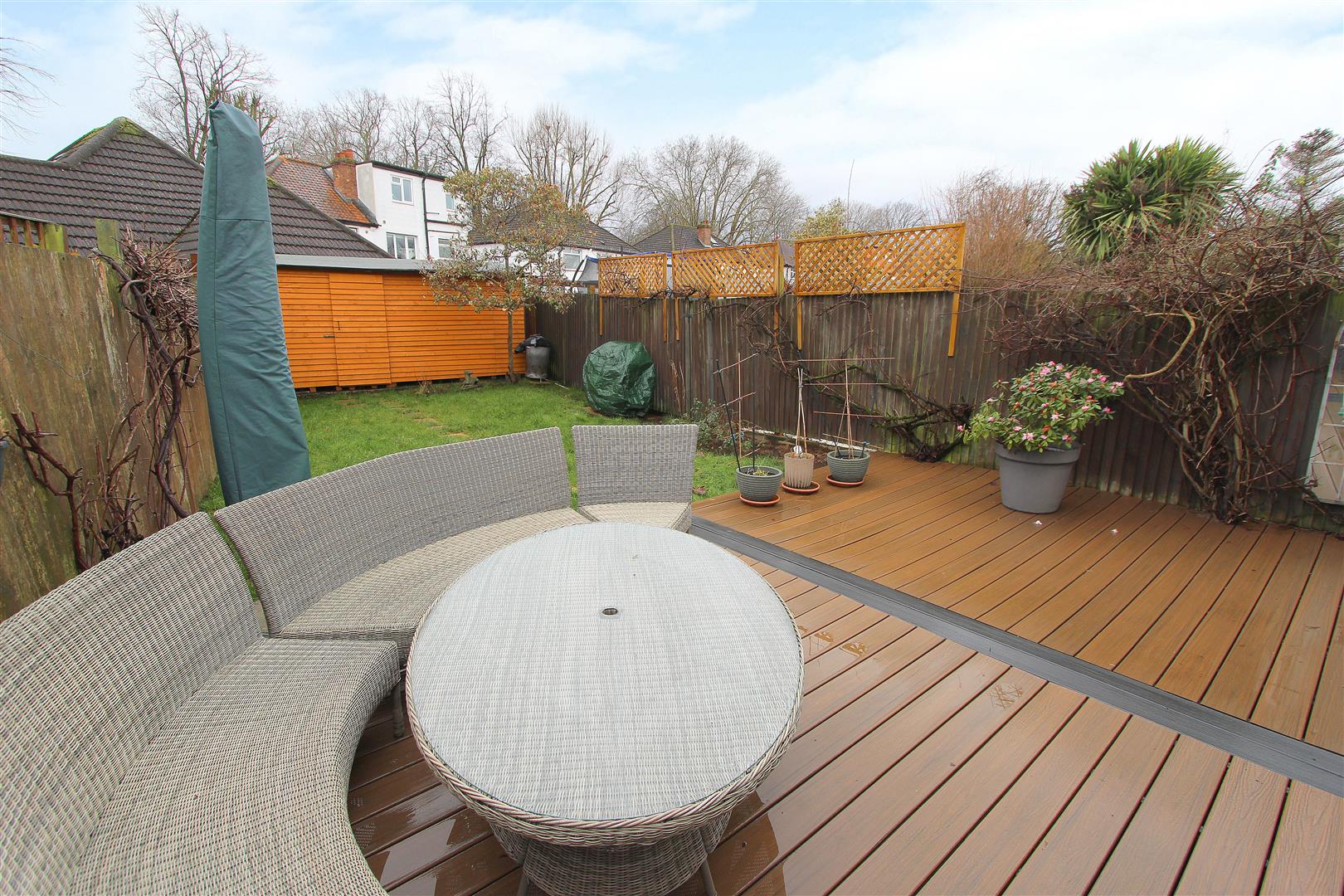 Rear garden – approximately 40ft (South facing) Composite decking area leading to lawn section with footpath to rear, lawn area with mature shrubs and flowerbeds bordering, large garden shed, gated side access, fence enclosed, outside tap.